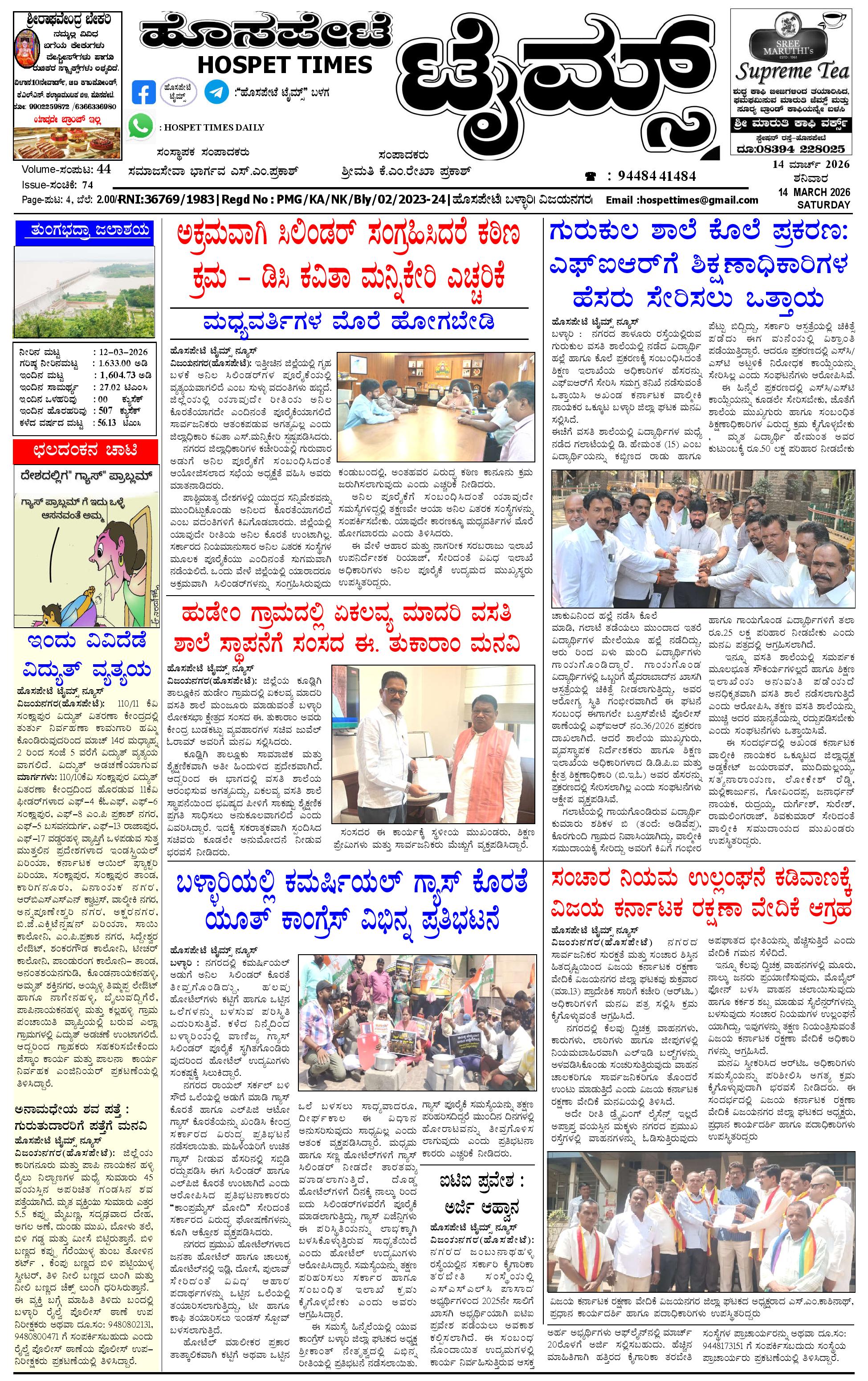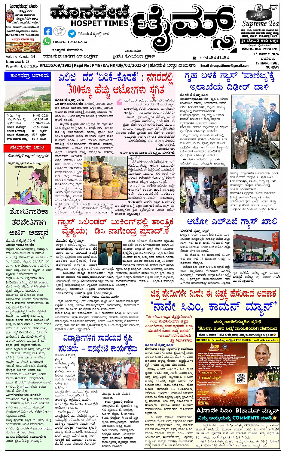 ಮಾಧ್ಯಮ ಅಕಾಡೆಮಿ ಪ್ರಶಸ್ತಿ ಪುರಸ್ಕೃತ 'ಹೊಸಪೇಟೆ ಟೈಮ್ಸ್' March 14, 2026 ಸ್ಥಳೀಯ ಸುದ್ದಿಗಳ ನೈಜ ಪ್ರತಿಬಿಂಬ << First << 1 >> Last >> Page 1Page 2Page 3Page 4 × ಮಾಧ್ಯಮ ಅಕಾಡೆಮಿ ಪ್ರಶಸ್ತಿ ಪುರಸ್ಕೃತ 'ಹೊಸಪೇಟೆ ಟೈಮ್ಸ್' HPT-14032026.F-page-001HPT-14032026.F-page-002HPT-14032026.F-page-003HPT-14032026.F-page-004 << First << 1 >> Last >> HPT-14032026.F-page-001HPT-14032026.F-page-002HPT-14032026.F-page-003HPT-14032026.F-page-004 HPT-14032026.F-page-001