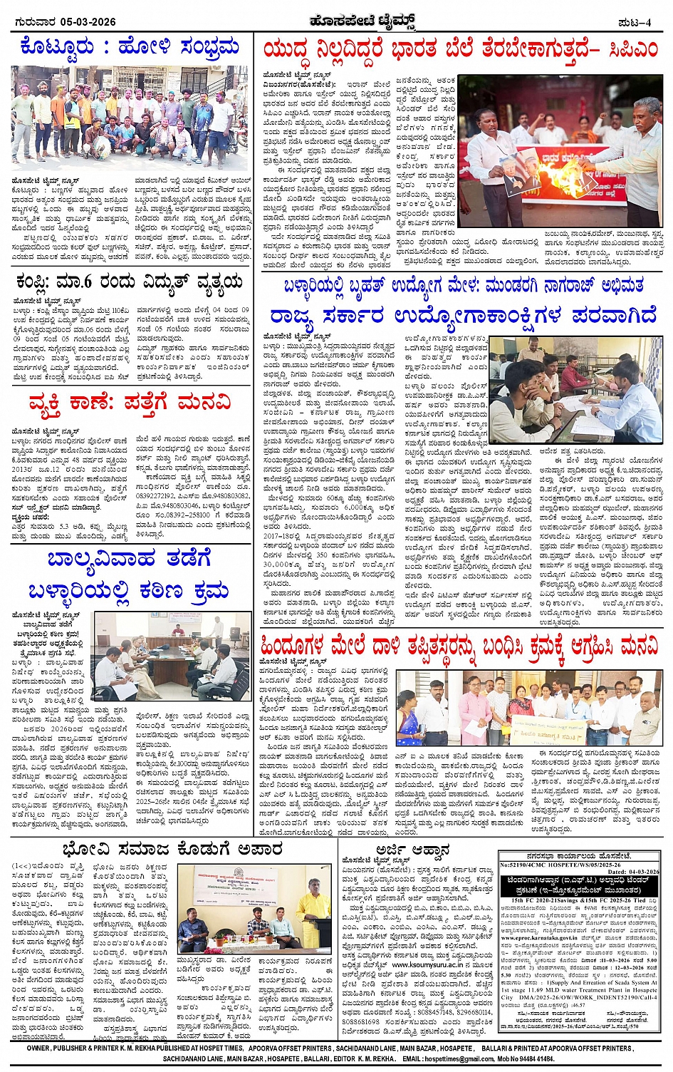 ಮಾಧ್ಯಮ ಅಕಾಡೆಮಿ ಪ್ರಶಸ್ತಿ ಪುರಸ್ಕೃತ 'ಹೊಸಪೇಟೆ ಟೈಮ್ಸ್' Page: 4 March 05, 2026 ಸ್ಥಳೀಯ ಸುದ್ದಿಗಳ ನೈಜ ಬಿಂಬ << First << 4 >> Last >> Page 1Page 2Page 3Page 4 × ಮಾಧ್ಯಮ ಅಕಾಡೆಮಿ ಪ್ರಶಸ್ತಿ ಪುರಸ್ಕೃತ 'ಹೊಸಪೇಟೆ ಟೈಮ್ಸ್' HPTM05032026-page-001HPTM05032026-page-002HPTM05032026-page-003HPTM05032026-page-004 << First << 4 >> Last >> HPTM05032026-page-001HPTM05032026-page-002HPTM05032026-page-003HPTM05032026-page-004 HPTM05032026-page-004