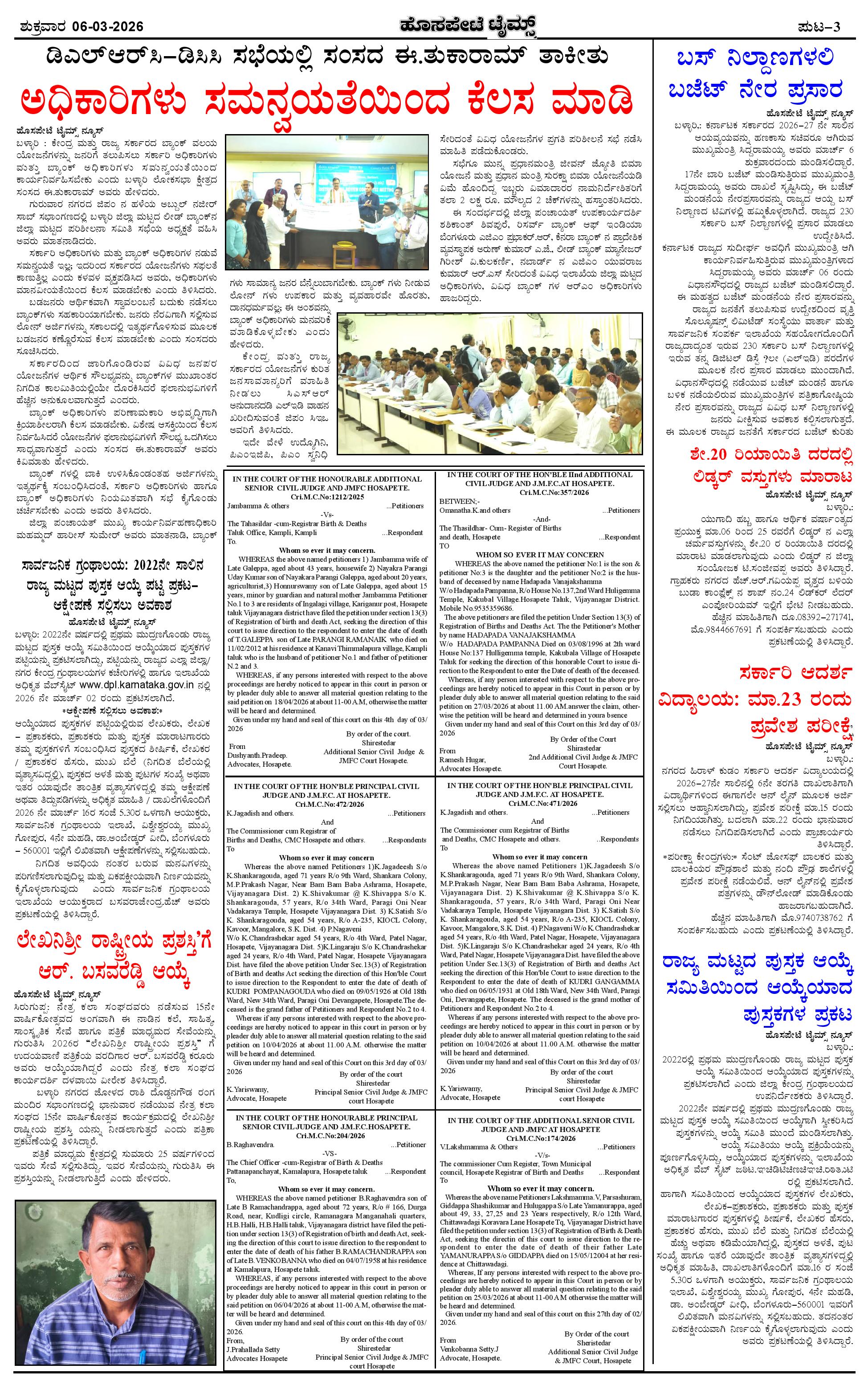 ಮಾಧ್ಯಮ ಅಕಾಡೆಮಿ ಪ್ರಶಸ್ತಿ ಪುರಸ್ಕೃತ 'ಹೊಸಪೇಟೆ ಟೈಮ್ಸ್' Page: 3 March 06, 2026 ಸ್ಥಳೀಯ ಸುದ್ದಿಗಳ ನೈಜ ಬಿಂಬ << First << 3 >> Last >> Page 1Page 2Page 3Page 4 × ಮಾಧ್ಯಮ ಅಕಾಡೆಮಿ ಪ್ರಶಸ್ತಿ ಪುರಸ್ಕೃತ 'ಹೊಸಪೇಟೆ ಟೈಮ್ಸ್' HPT-06032026-page-001HPT-06032026-page-002HPT-06032026-page-003HPT-06032026-page-004 << First << 3 >> Last >> HPT-06032026-page-001HPT-06032026-page-002HPT-06032026-page-003HPT-06032026-page-004 HPT-06032026-page-003