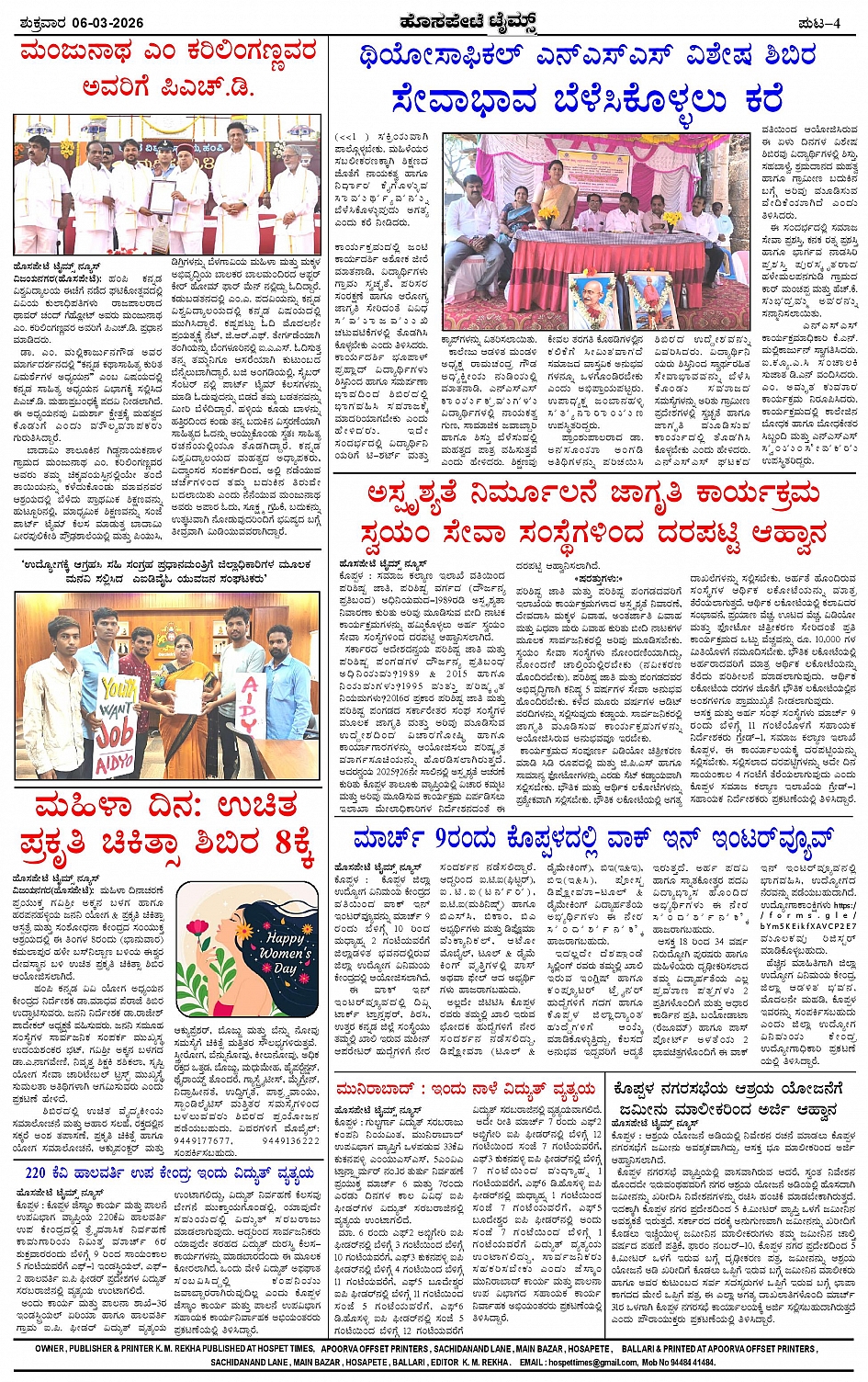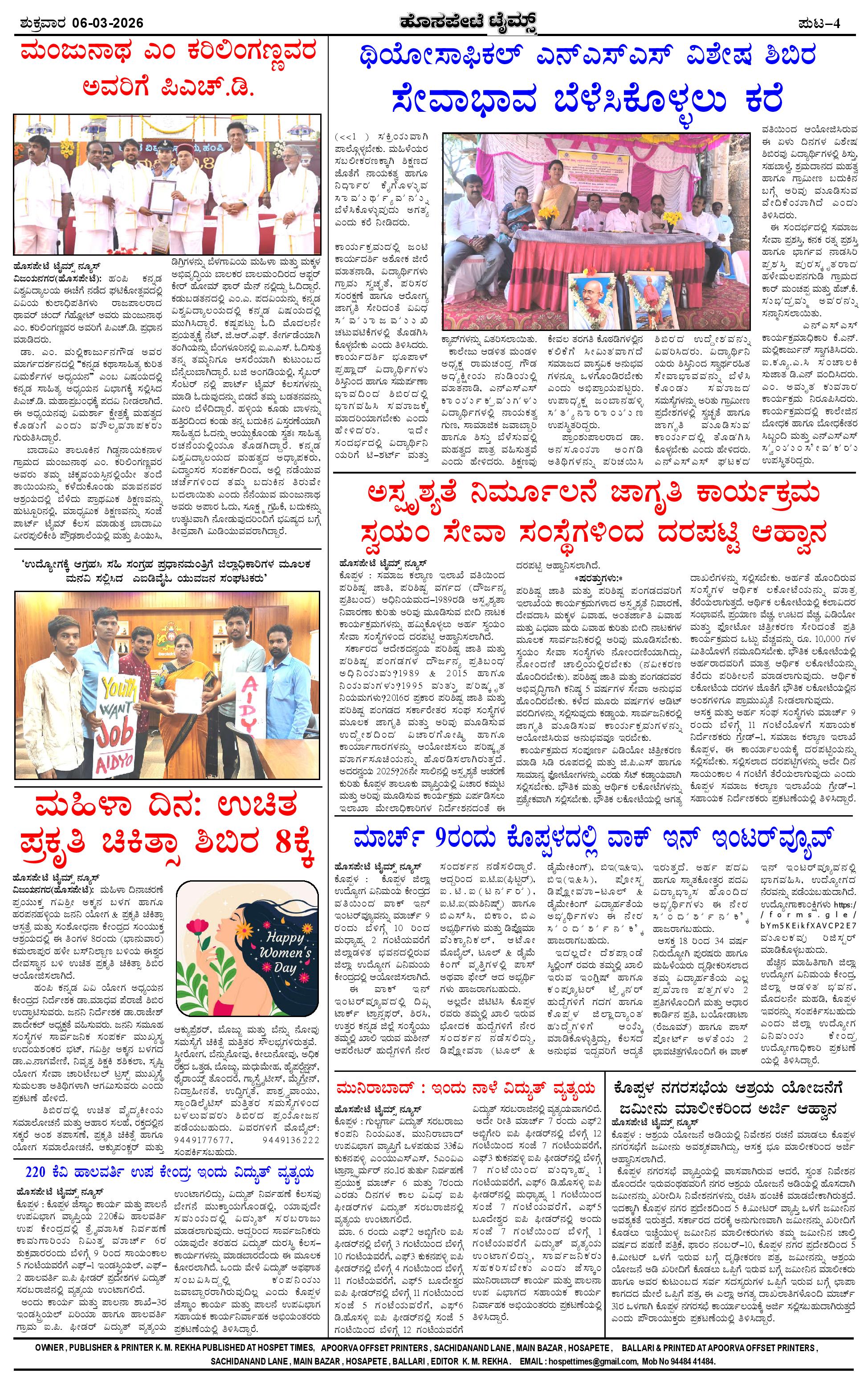 ಮಾಧ್ಯಮ ಅಕಾಡೆಮಿ ಪ್ರಶಸ್ತಿ ಪುರಸ್ಕೃತ 'ಹೊಸಪೇಟೆ ಟೈಮ್ಸ್' Page: 4 March 06, 2026 ಸ್ಥಳೀಯ ಸುದ್ದಿಗಳ ನೈಜ ಬಿಂಬ << First << 4 >> Last >> Page 1Page 2Page 3Page 4 × ಮಾಧ್ಯಮ ಅಕಾಡೆಮಿ ಪ್ರಶಸ್ತಿ ಪುರಸ್ಕೃತ 'ಹೊಸಪೇಟೆ ಟೈಮ್ಸ್' HPT-06032026-page-001HPT-06032026-page-002HPT-06032026-page-003HPT-06032026-page-004 << First << 4 >> Last >> HPT-06032026-page-001HPT-06032026-page-002HPT-06032026-page-003HPT-06032026-page-004 HPT-06032026-page-004