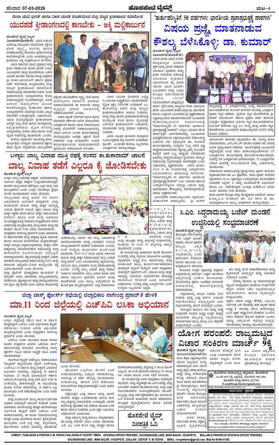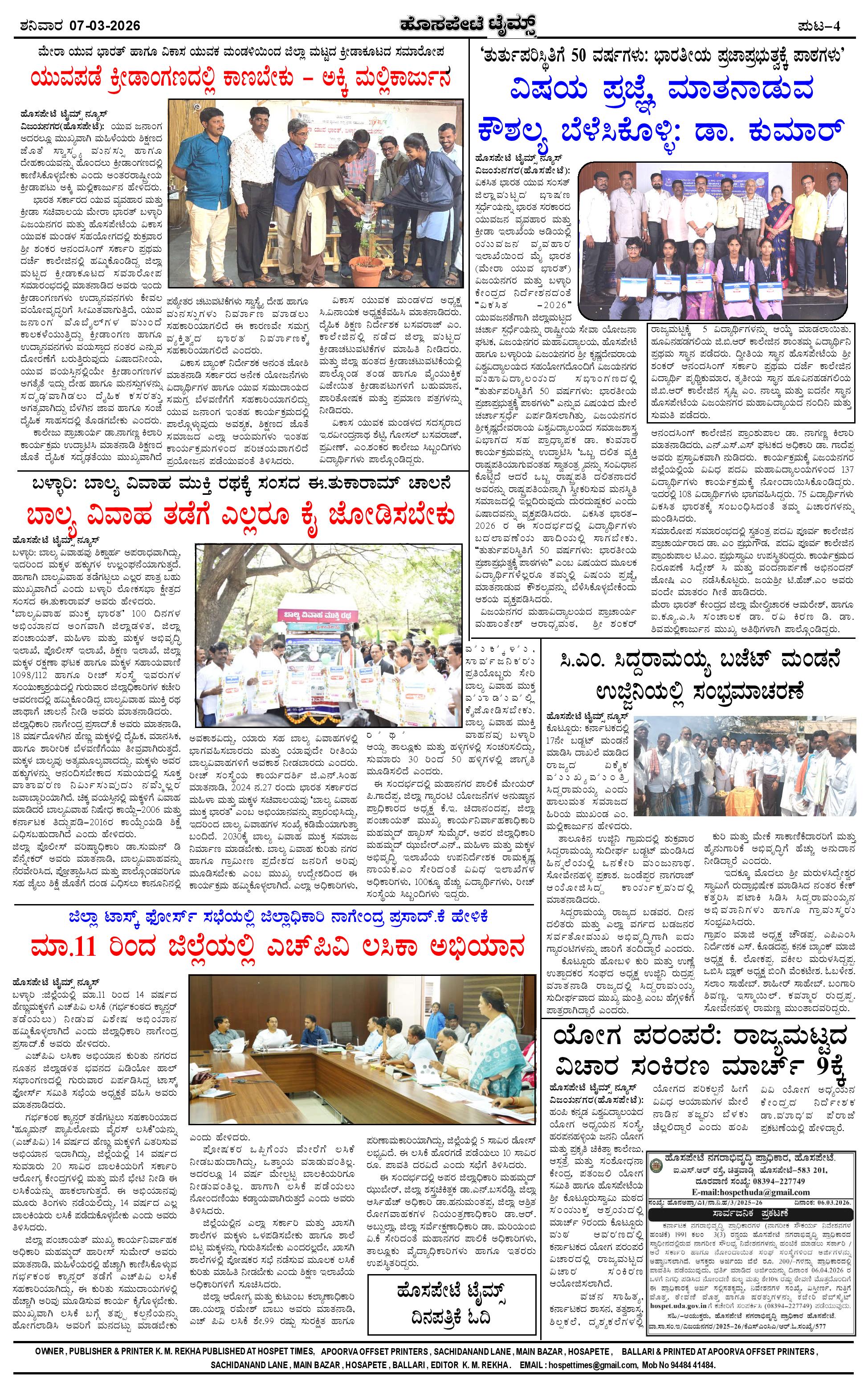 ಮಾಧ್ಯಮ ಅಕಾಡೆಮಿ ಪ್ರಶಸ್ತಿ ಪುರಸ್ಕೃತ 'ಹೊಸಪೇಟೆ ಟೈಮ್ಸ್' Page: 4 March 07, 2026 ಸ್ಥಳೀಯ ಸುದ್ದಿಗಳ ನೈಜ ಪ್ರತಿಬಿಂಬ << First << 4 >> Last >> Page 1Page 2Page 3Page 4 × ಮಾಧ್ಯಮ ಅಕಾಡೆಮಿ ಪ್ರಶಸ್ತಿ ಪುರಸ್ಕೃತ 'ಹೊಸಪೇಟೆ ಟೈಮ್ಸ್' HPT-07032026-page-001HPT-07032026-page-002HPT-07032026-page-003HPT-07032026-page-004 << First << 4 >> Last >> HPT-07032026-page-001HPT-07032026-page-002HPT-07032026-page-003HPT-07032026-page-004 HPT-07032026-page-004