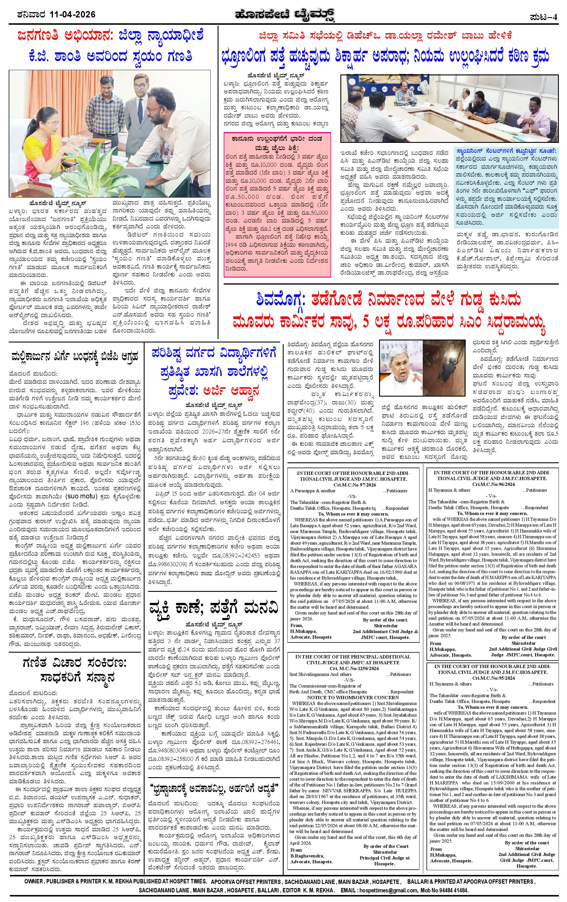 ಮಾಧ್ಯಮ ಅಕಾಡೆಮಿ ಪ್ರಶಸ್ತಿ ಪುರಸ್ಕೃತ 'ಹೊಸಪೇಟೆ ಟೈಮ್ಸ್' Page: 4 April 11, 2026 << First << 4 >> Last >> Page 1Page 2Page 3Page 4 × ಮಾಧ್ಯಮ ಅಕಾಡೆಮಿ ಪ್ರಶಸ್ತಿ ಪುರಸ್ಕೃತ 'ಹೊಸಪೇಟೆ ಟೈಮ್ಸ್' HPT-11042026-4-page-001HPT-11042026-4-page-002HPT-11042026-4-page-003HPT-11042026-4-page-004 << First << 4 >> Last >> HPT-11042026-4-page-001HPT-11042026-4-page-002HPT-11042026-4-page-003HPT-11042026-4-page-004 HPT-11042026-4-page-004