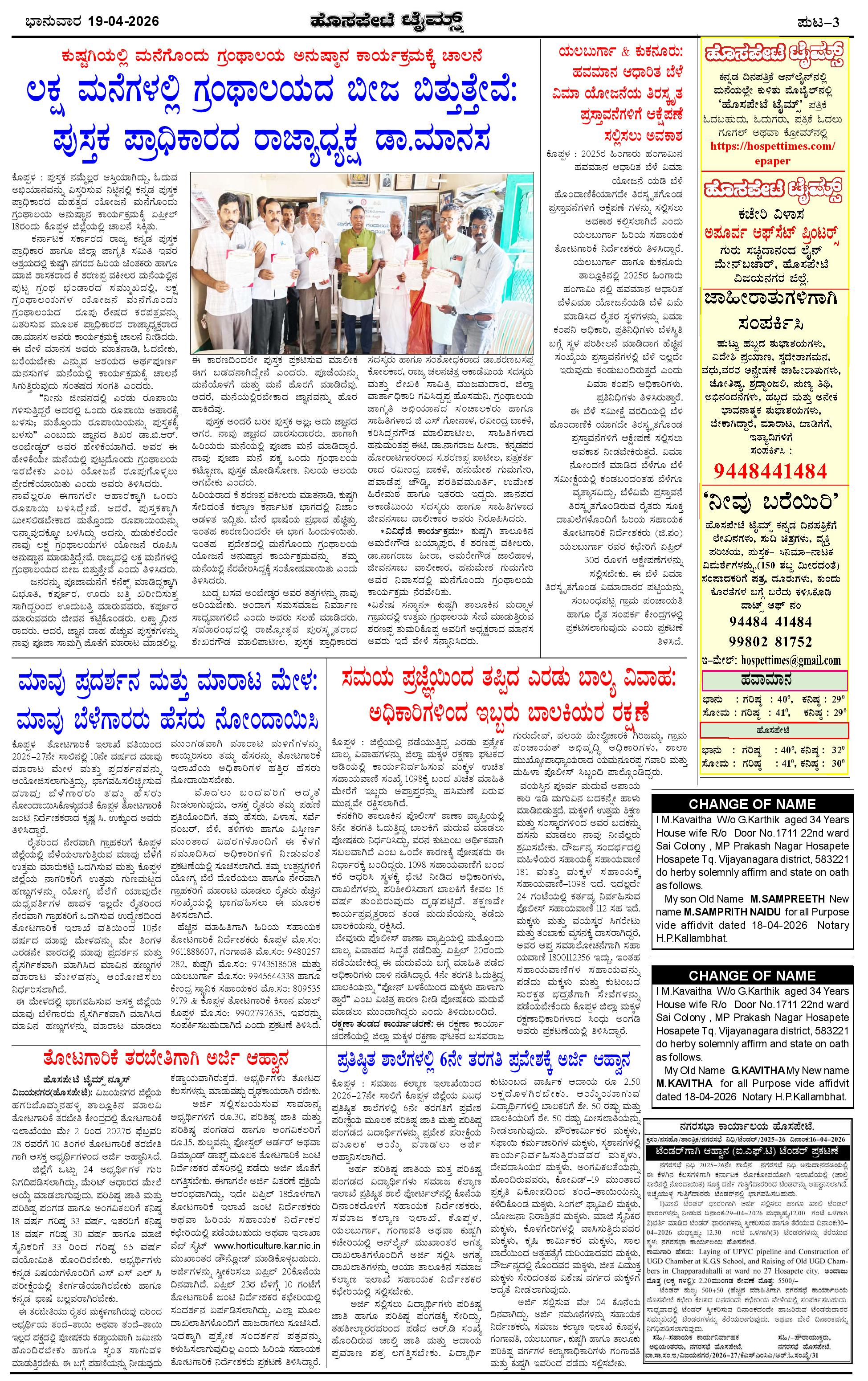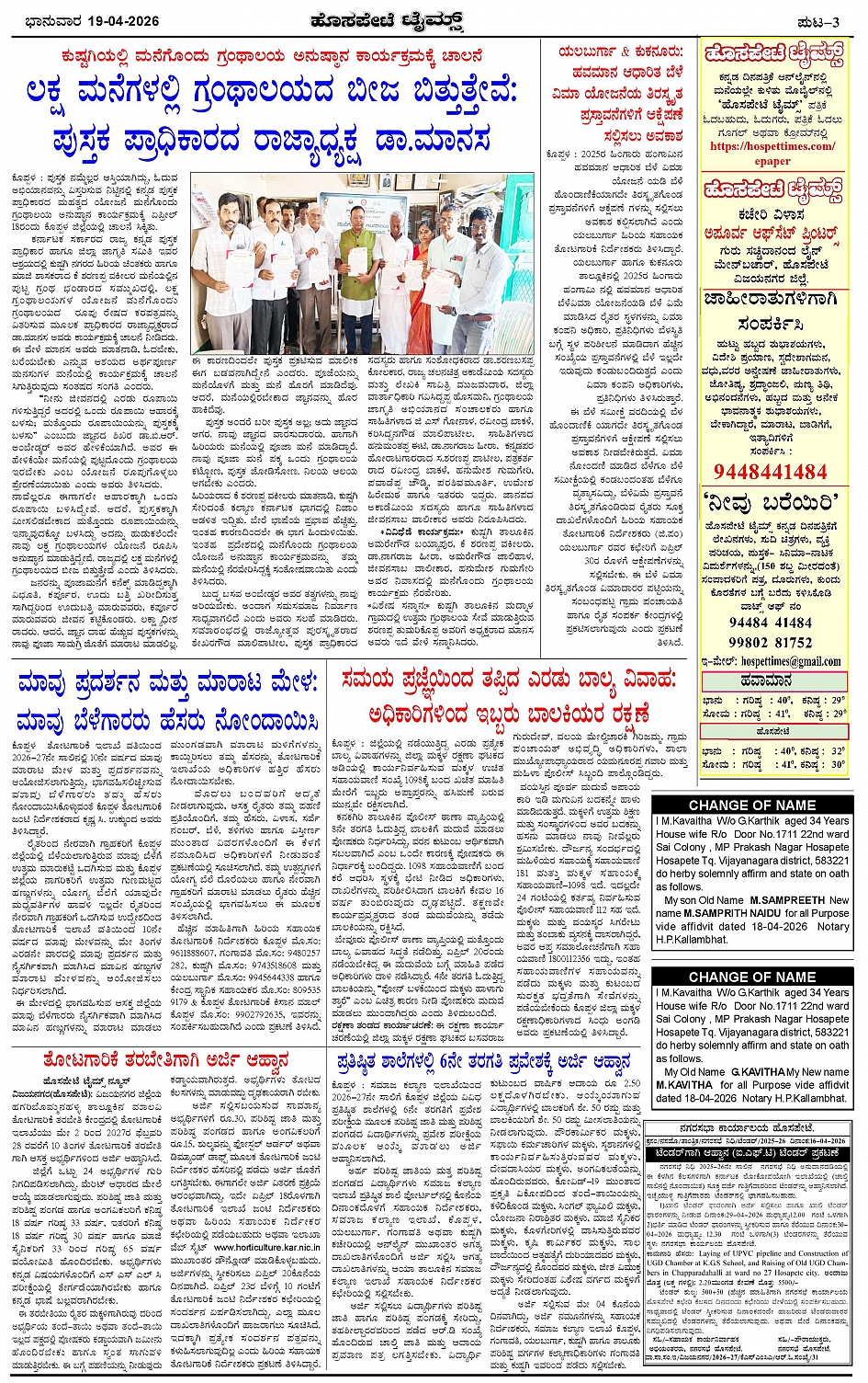 ಮಾಧ್ಯಮ ಅಕಾಡೆಮಿ ಪ್ರಶಸ್ತಿ ಪುರಸ್ಕೃತ 'ಹೊಸಪೇಟೆ ಟೈಮ್ಸ್' Page: 3 April 19, 2026 << First << 3 >> Last >> Page 1Page 2Page 3Page 4 × ಮಾಧ್ಯಮ ಅಕಾಡೆಮಿ ಪ್ರಶಸ್ತಿ ಪುರಸ್ಕೃತ 'ಹೊಸಪೇಟೆ ಟೈಮ್ಸ್' HPT-19042026--4-page-001HPT-19042026--4-page-002HPT-19042026--4-page-003HPT-19042026--4-page-004 << First << 3 >> Last >> HPT-19042026--4-page-001HPT-19042026--4-page-002HPT-19042026--4-page-003HPT-19042026--4-page-004 HPT-19042026--4-page-003