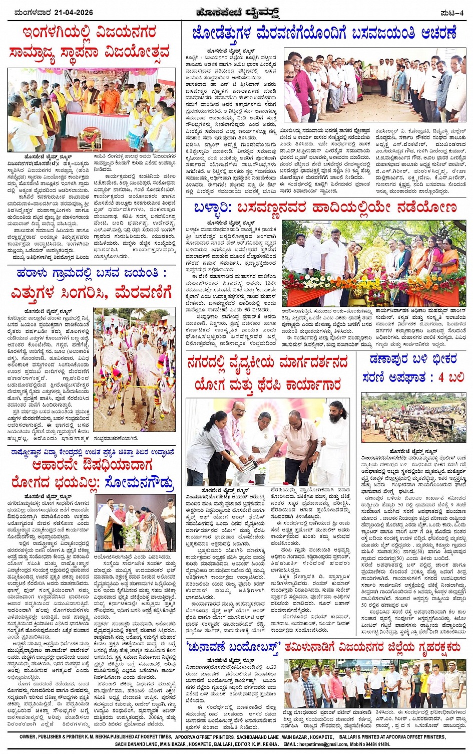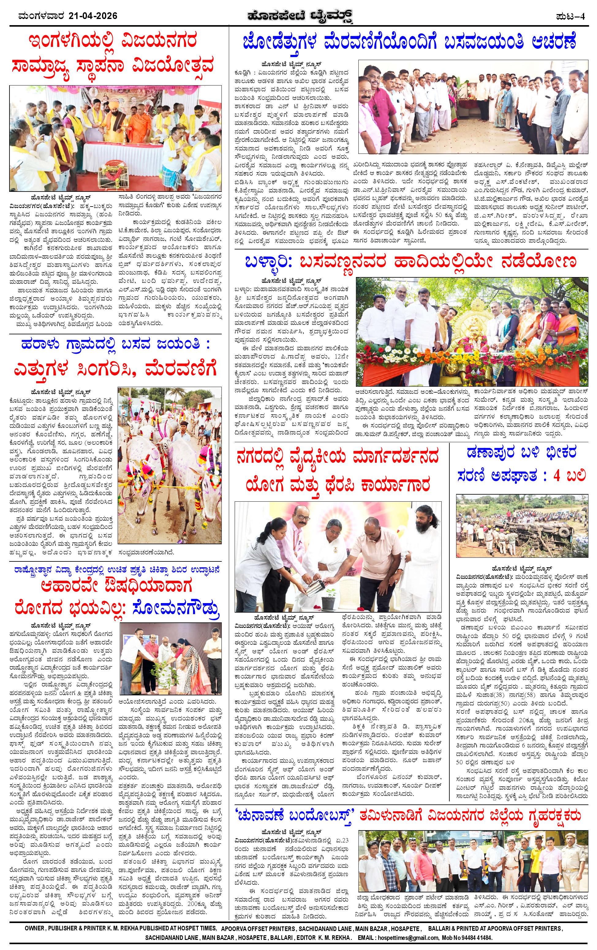 ಮಾಧ್ಯಮ ಅಕಾಡೆಮಿ ಪ್ರಶಸ್ತಿ ಪುರಸ್ಕೃತ 'ಹೊಸಪೇಟೆ ಟೈಮ್ಸ್' Page: 4 April 21, 2026 << First << 4 >> Last >> Page 1Page 2Page 3Page 4 × ಮಾಧ್ಯಮ ಅಕಾಡೆಮಿ ಪ್ರಶಸ್ತಿ ಪುರಸ್ಕೃತ 'ಹೊಸಪೇಟೆ ಟೈಮ್ಸ್' HPT-21042026-page-001HPT-21042026-page-002HPT-21042026-page-003HPT-21042026-page-004 << First << 4 >> Last >> HPT-21042026-page-001HPT-21042026-page-002HPT-21042026-page-003HPT-21042026-page-004 HPT-21042026-page-004