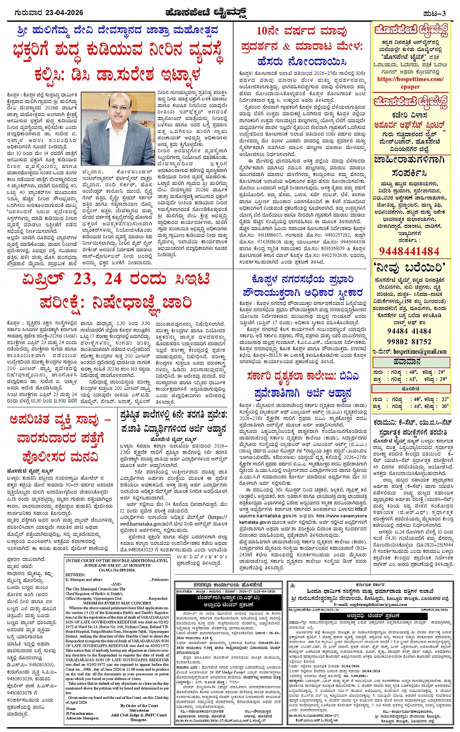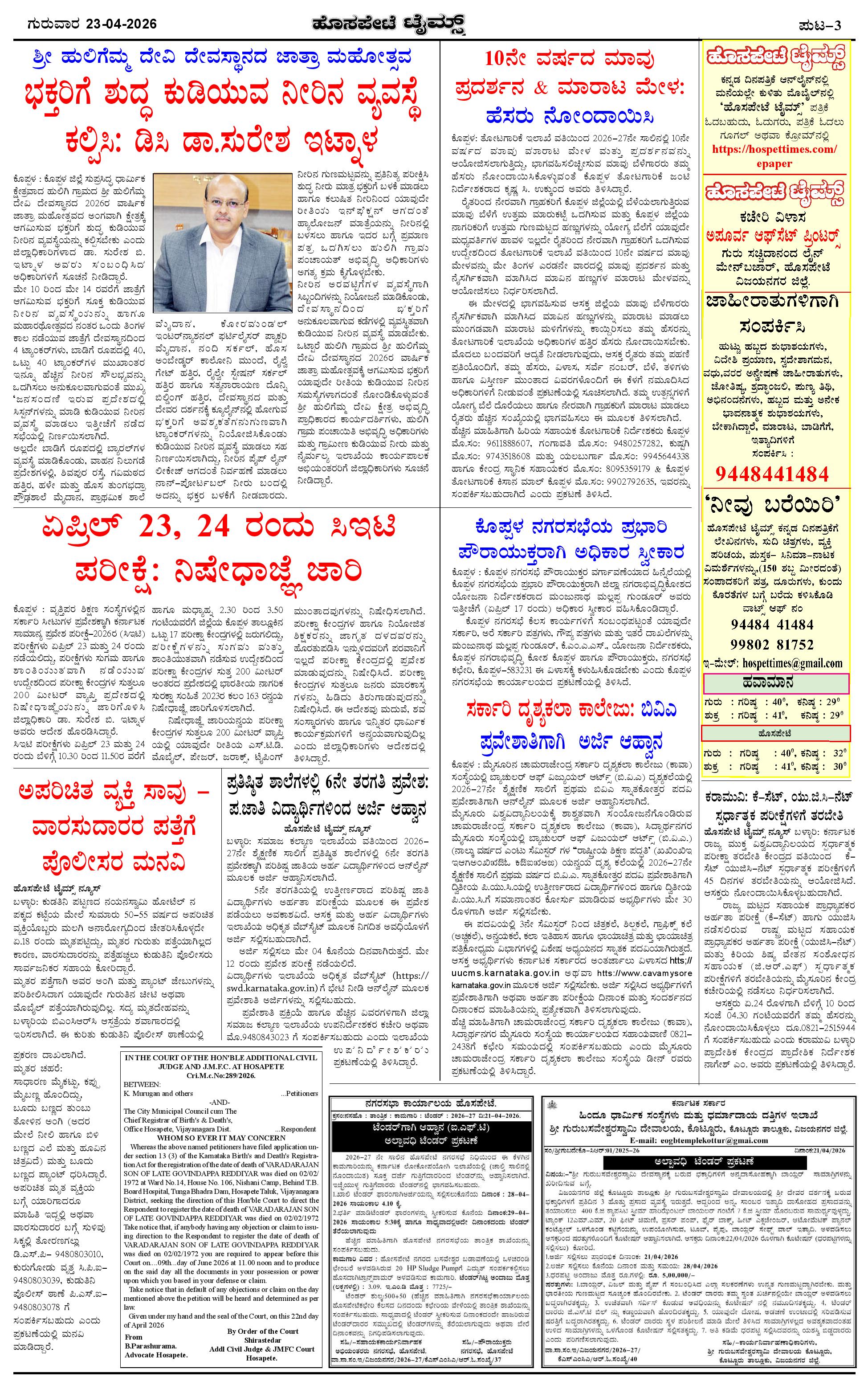 ಮಾಧ್ಯಮ ಅಕಾಡೆಮಿ ಪ್ರಶಸ್ತಿ ಪುರಸ್ಕೃತ 'ಹೊಸಪೇಟೆ ಟೈಮ್ಸ್' Page: 3 April 23, 2026 << First << 3 >> Last >> Page 1Page 2Page 3Page 4 × ಮಾಧ್ಯಮ ಅಕಾಡೆಮಿ ಪ್ರಶಸ್ತಿ ಪುರಸ್ಕೃತ 'ಹೊಸಪೇಟೆ ಟೈಮ್ಸ್' HPT-23042026-4-page-001HPT-23042026-4-page-002HPT-23042026-4-page-003HPT-23042026-4-page-004 << First << 3 >> Last >> HPT-23042026-4-page-001HPT-23042026-4-page-002HPT-23042026-4-page-003HPT-23042026-4-page-004 HPT-23042026-4-page-003
