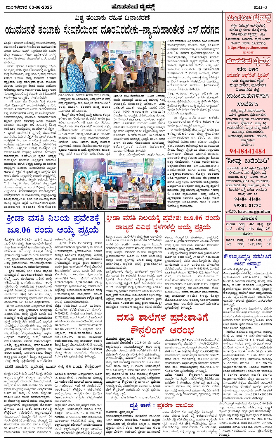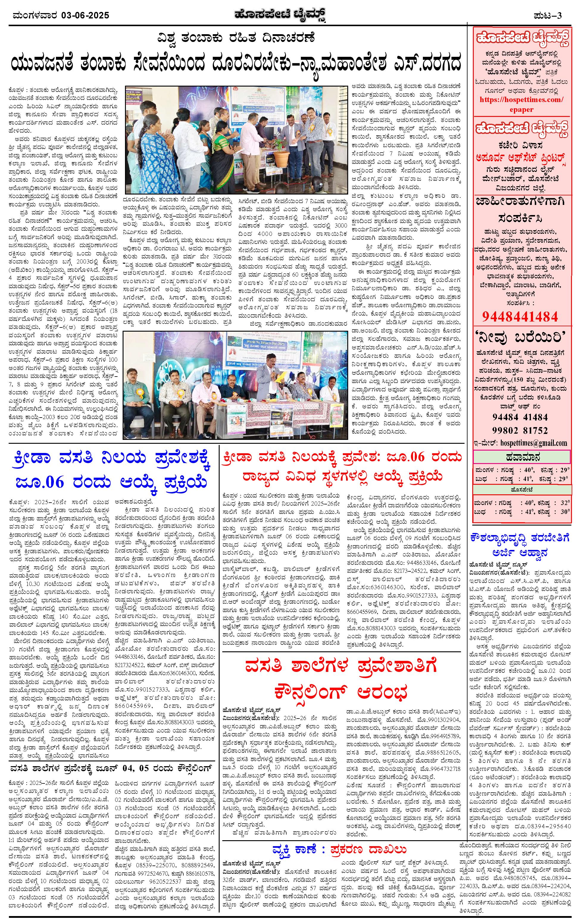 ಮಾಧ್ಯಮ ಅಕಾಡೆಮಿ ಪ್ರಶಸ್ತಿ ಪುರಸ್ಕೃತ 'ಹೊಸಪೇಟೆ ಟೈಮ್ಸ್' Page: 3 June 03, 2025 << First << 3 >> Last >> Page 1Page 2Page 3Page 4 × ಮಾಧ್ಯಮ ಅಕಾಡೆಮಿ ಪ್ರಶಸ್ತಿ ಪುರಸ್ಕೃತ 'ಹೊಸಪೇಟೆ ಟೈಮ್ಸ್' HPT-03062025--4-page-001HPT-03062025--4-page-002HPT-03062025--4-page-003HPT-03062025--4-page-004 << First << 3 >> Last >> HPT-03062025--4-page-001HPT-03062025--4-page-002HPT-03062025--4-page-003HPT-03062025--4-page-004 HPT-03062025--4-page-003