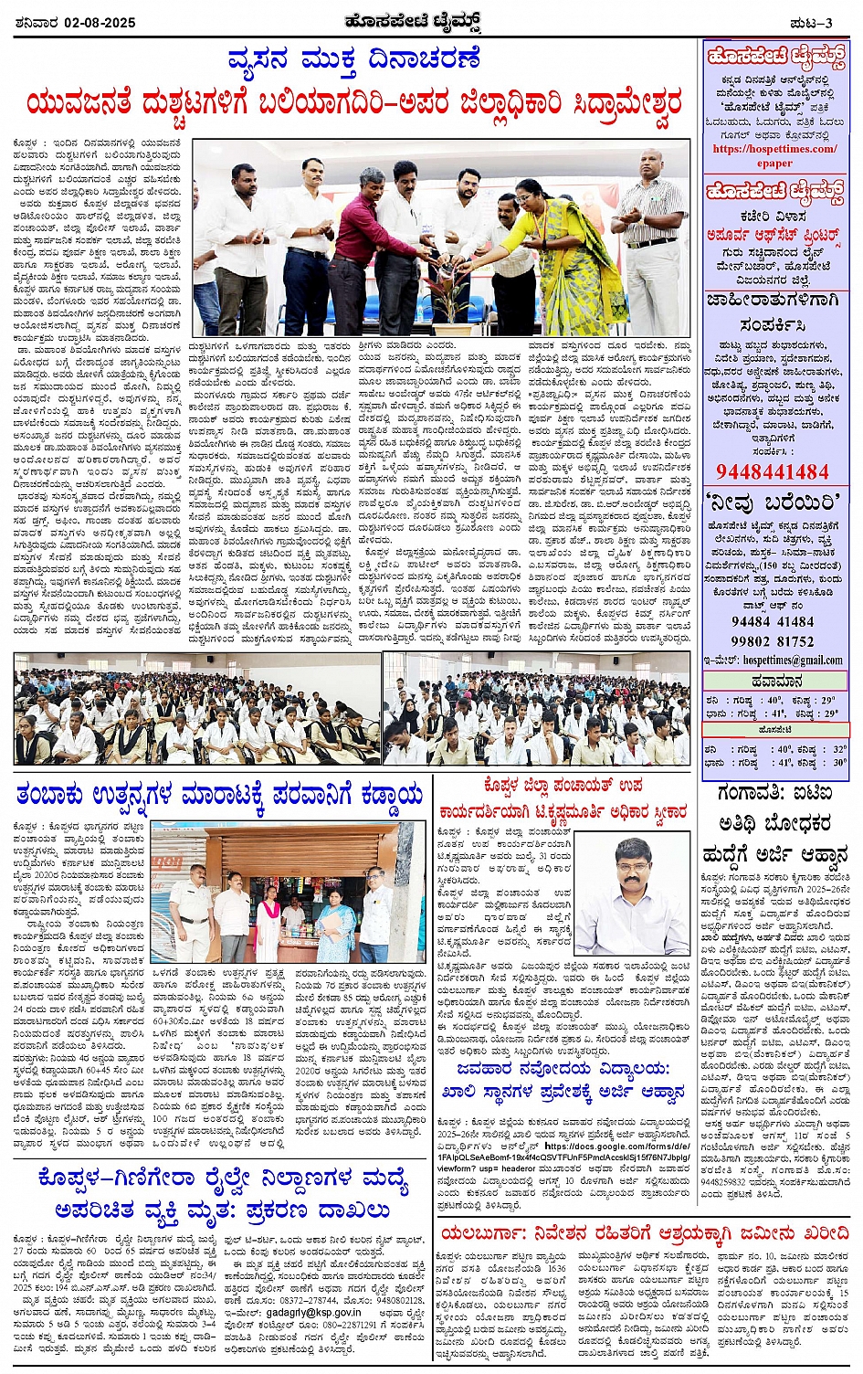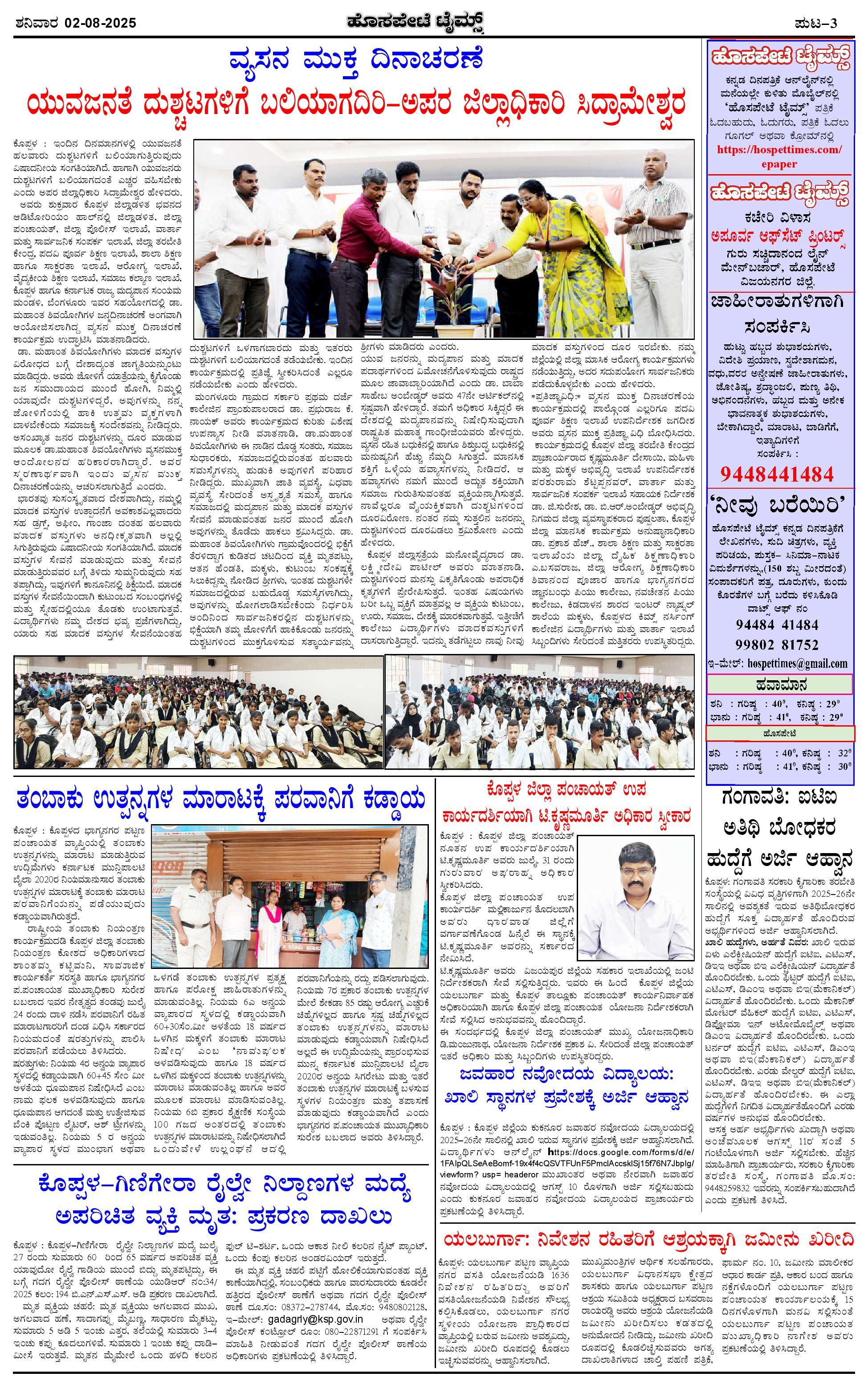 ಮಾಧ್ಯಮ ಅಕಾಡೆಮಿ ಪ್ರಶಸ್ತಿ ಪುರಸ್ಕೃತ 'ಹೊಸಪೇಟೆ ಟೈಮ್ಸ್' Page: 3 August 02, 2025 << First << 3 >> Last >> Page 1Page 2Page 3Page 4 × ಮಾಧ್ಯಮ ಅಕಾಡೆಮಿ ಪ್ರಶಸ್ತಿ ಪುರಸ್ಕೃತ 'ಹೊಸಪೇಟೆ ಟೈಮ್ಸ್' HPT-02082025--4-page-001HPT-02082025--4-page-002HPT-02082025--4-page-003HPT-02082025--4-page-004 << First << 3 >> Last >> HPT-02082025--4-page-001HPT-02082025--4-page-002HPT-02082025--4-page-003HPT-02082025--4-page-004 HPT-02082025--4-page-003