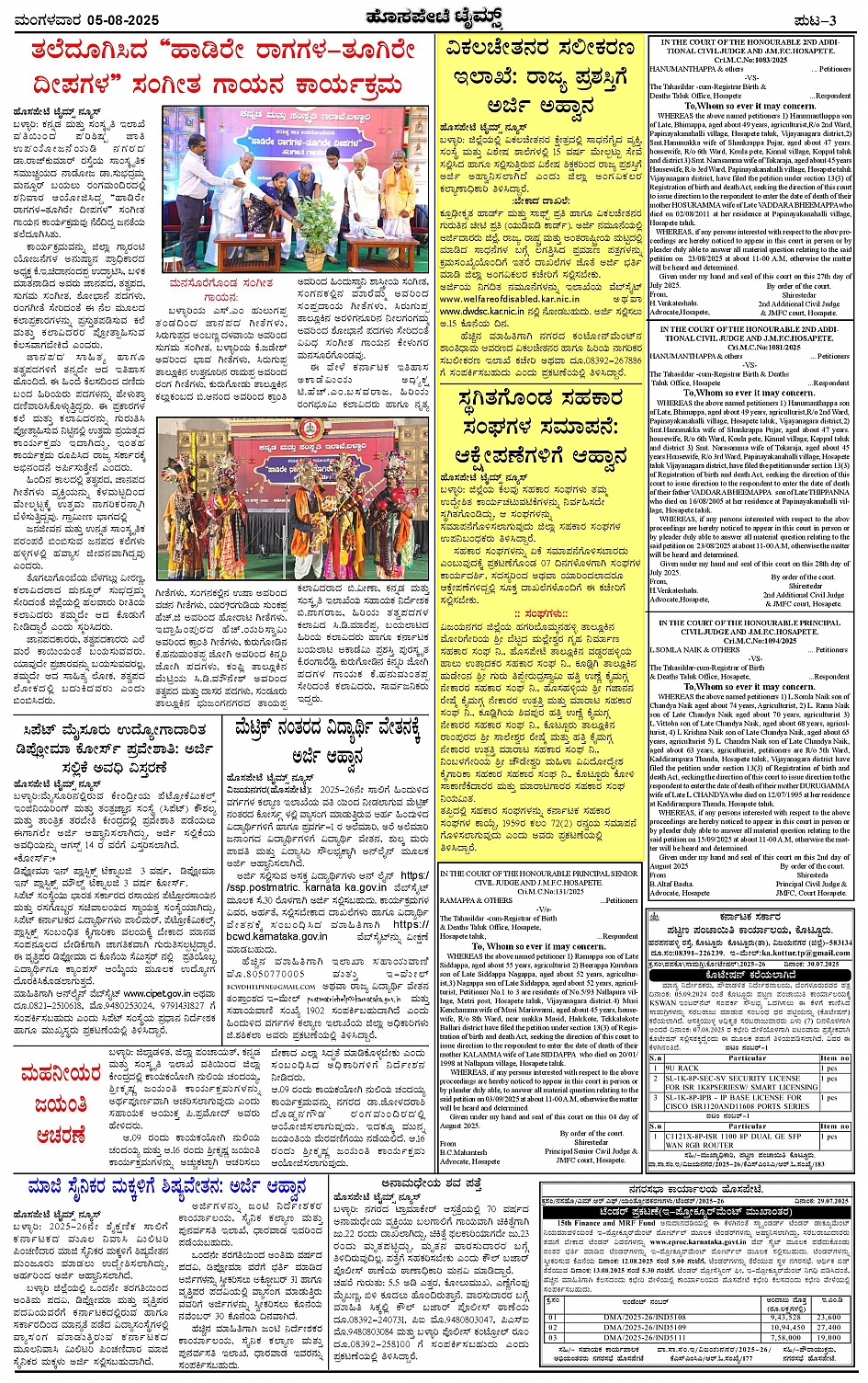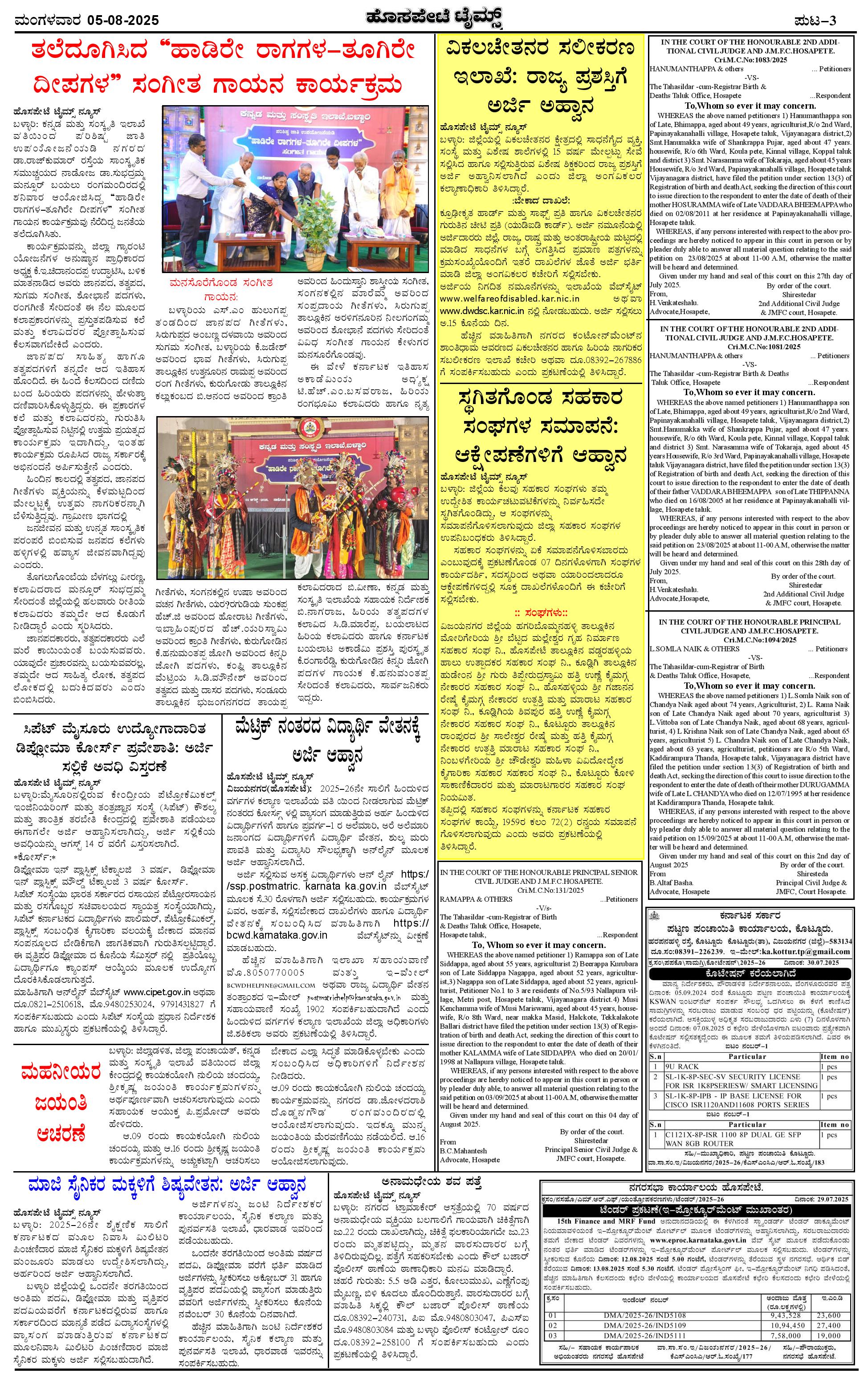 ಮಾಧ್ಯಮ ಅಕಾಡೆಮಿ ಪ್ರಶಸ್ತಿ ಪುರಸ್ಕೃತ 'ಹೊಸಪೇಟೆ ಟೈಮ್ಸ್' Page: 3 August 05, 2025 ಸ್ಥಳೀಯ ಸುದ್ದಿಗಳ ನೈಜ ಪ್ರತಿಬಿಂಬ << First << 3 >> Last >> Page 1Page 2Page 3Page 4 × ಮಾಧ್ಯಮ ಅಕಾಡೆಮಿ ಪ್ರಶಸ್ತಿ ಪುರಸ್ಕೃತ 'ಹೊಸಪೇಟೆ ಟೈಮ್ಸ್' HPT05082025-page-001HPT05082025-page-002HPT05082025-page-003HPT05082025-page-004 << First << 3 >> Last >> HPT05082025-page-001HPT05082025-page-002HPT05082025-page-003HPT05082025-page-004 HPT05082025-page-003