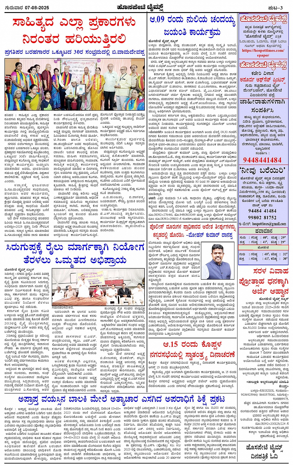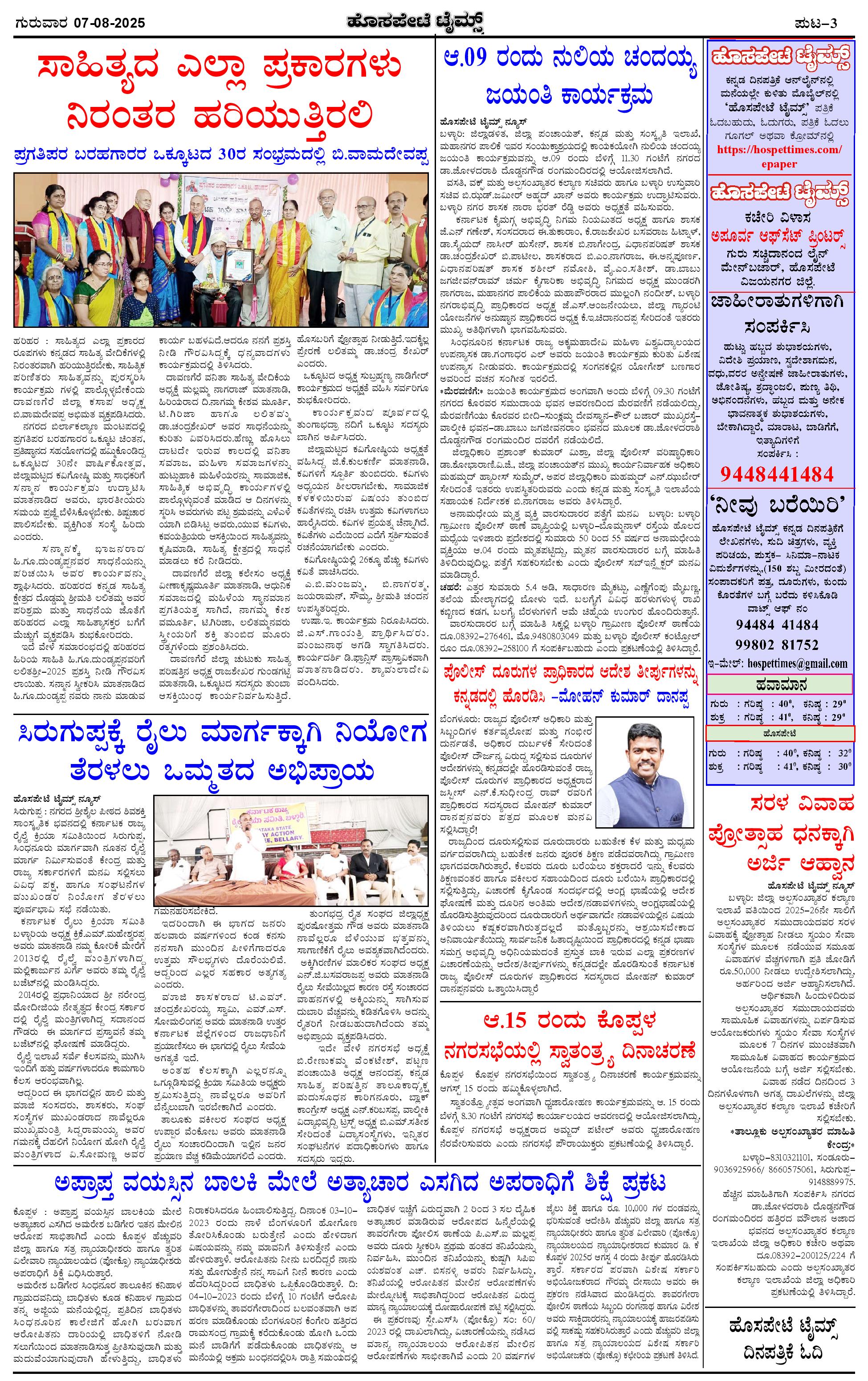 ಮಾಧ್ಯಮ ಅಕಾಡೆಮಿ ಪ್ರಶಸ್ತಿ ಪುರಸ್ಕೃತ 'ಹೊಸಪೇಟೆ ಟೈಮ್ಸ್' Page: 3 August 07, 2025 << First << 3 >> Last >> Page 1Page 2Page 3Page 4 × ಮಾಧ್ಯಮ ಅಕಾಡೆಮಿ ಪ್ರಶಸ್ತಿ ಪುರಸ್ಕೃತ 'ಹೊಸಪೇಟೆ ಟೈಮ್ಸ್' HPT-07082025--4-page-001HPT-07082025--4-page-002HPT-07082025--4-page-003HPT-07082025--4-page-004 << First << 3 >> Last >> HPT-07082025--4-page-001HPT-07082025--4-page-002HPT-07082025--4-page-003HPT-07082025--4-page-004 HPT-07082025--4-page-003