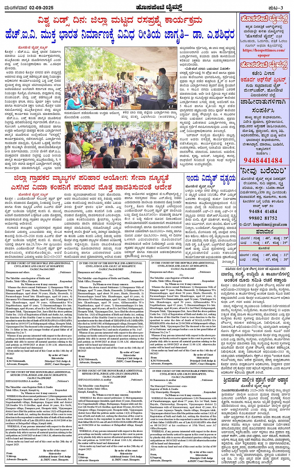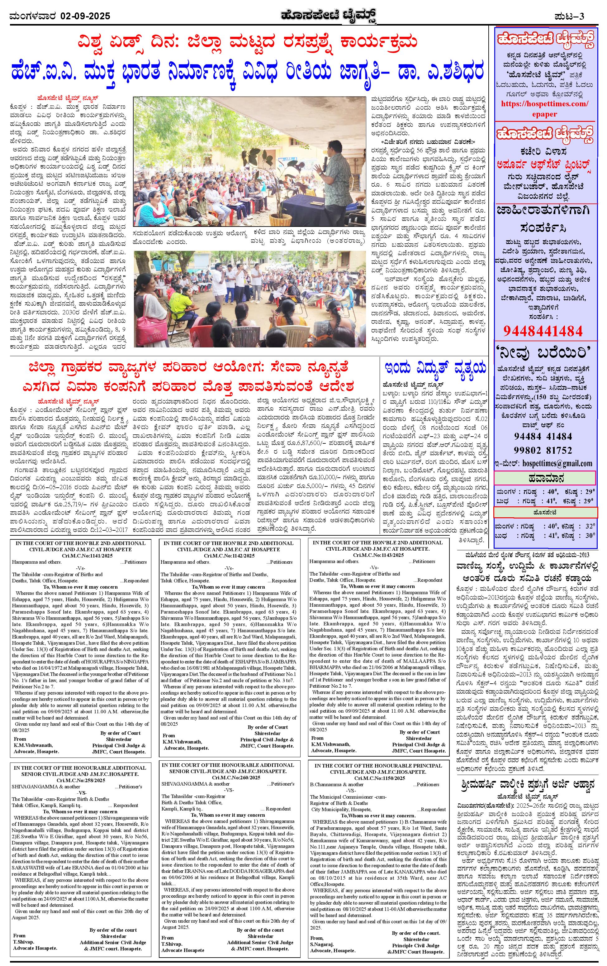 ಮಾಧ್ಯಮ ಅಕಾಡೆಮಿ ಪ್ರಶಸ್ತಿ ಪುರಸ್ಕೃತ 'ಹೊಸಪೇಟೆ ಟೈಮ್ಸ್' Page: 3 September 02, 2025 << First << 3 >> Last >> Page 1Page 2Page 3Page 4 × ಮಾಧ್ಯಮ ಅಕಾಡೆಮಿ ಪ್ರಶಸ್ತಿ ಪುರಸ್ಕೃತ 'ಹೊಸಪೇಟೆ ಟೈಮ್ಸ್' HPT-02092025-4-page-001HPT-02092025-4-page-002HPT-02092025-4-page-003HPT-02092025-4-page-004 << First << 3 >> Last >> HPT-02092025-4-page-001HPT-02092025-4-page-002HPT-02092025-4-page-003HPT-02092025-4-page-004 HPT-02092025-4-page-003