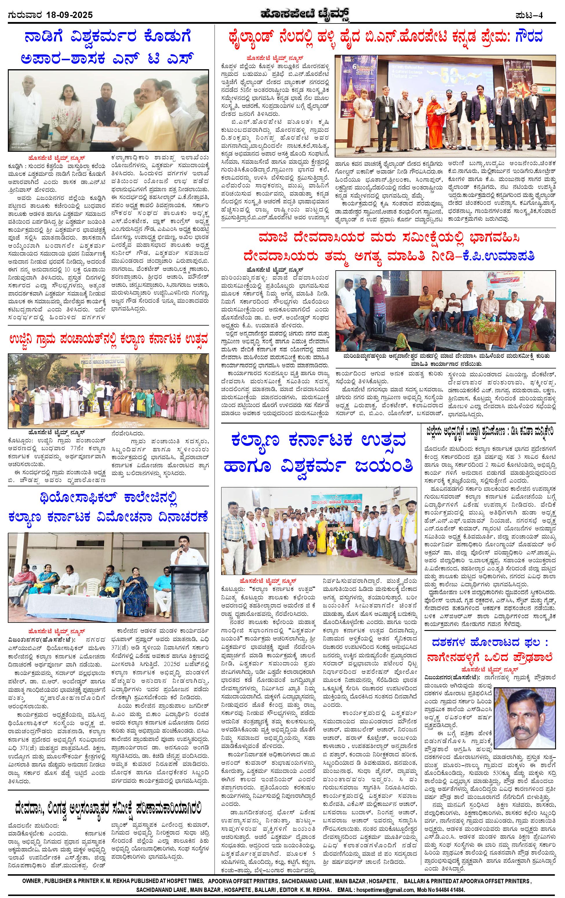 ಮಾಧ್ಯಮ ಅಕಾಡೆಮಿ ಪ್ರಶಸ್ತಿ ಪುರಸ್ಕೃತ 'ಹೊಸಪೇಟೆ ಟೈಮ್ಸ್' Page: 4 September 18, 2025 << First << 4 >> Last >> Page 1Page 2Page 3Page 4 × ಮಾಧ್ಯಮ ಅಕಾಡೆಮಿ ಪ್ರಶಸ್ತಿ ಪುರಸ್ಕೃತ 'ಹೊಸಪೇಟೆ ಟೈಮ್ಸ್' HPT-18092025--4-page-001HPT-18092025--4-page-002HPT-18092025--4-page-003HPT-18092025--4-page-004 << First << 4 >> Last >> HPT-18092025--4-page-001HPT-18092025--4-page-002HPT-18092025--4-page-003HPT-18092025--4-page-004 HPT-18092025--4-page-004