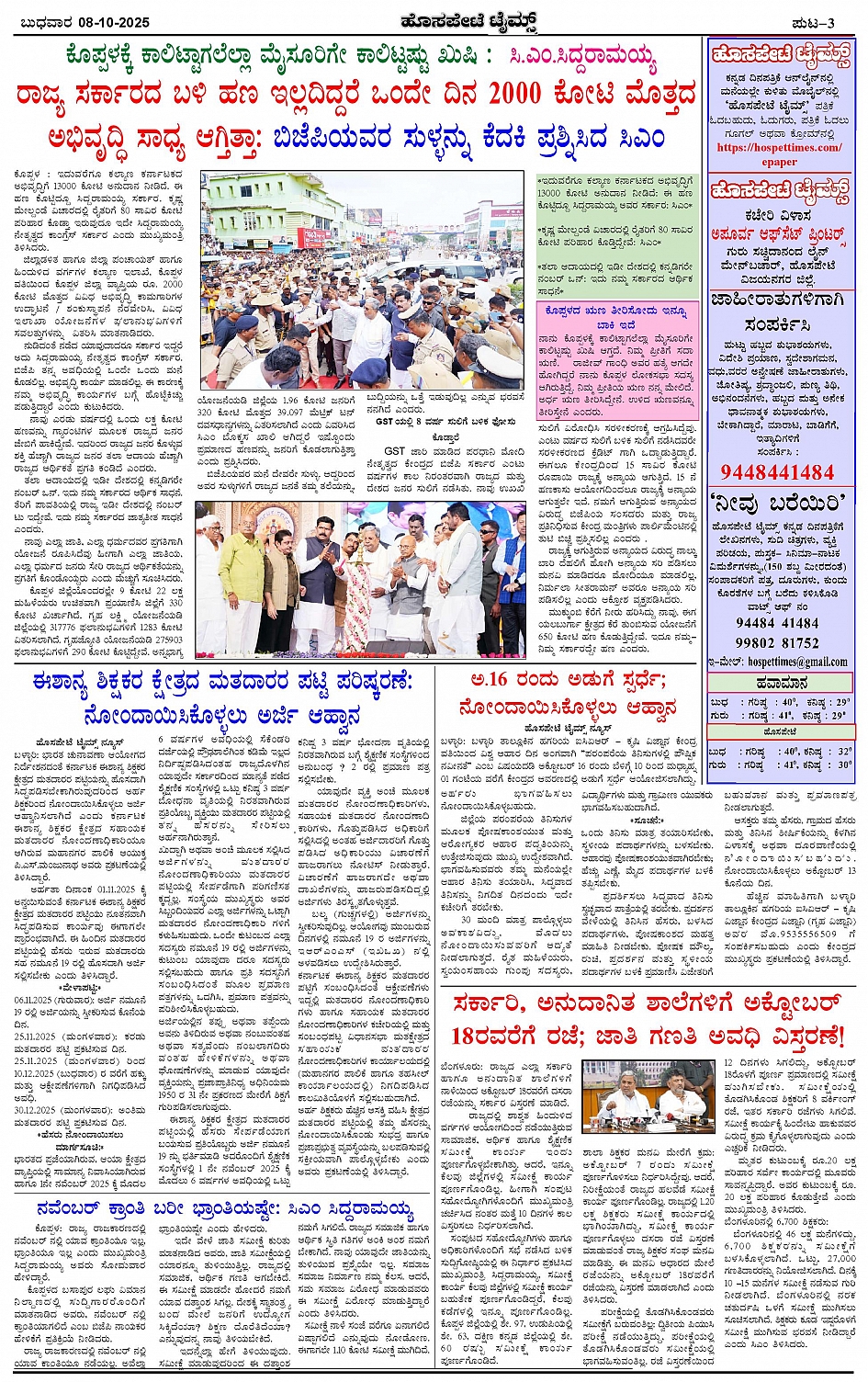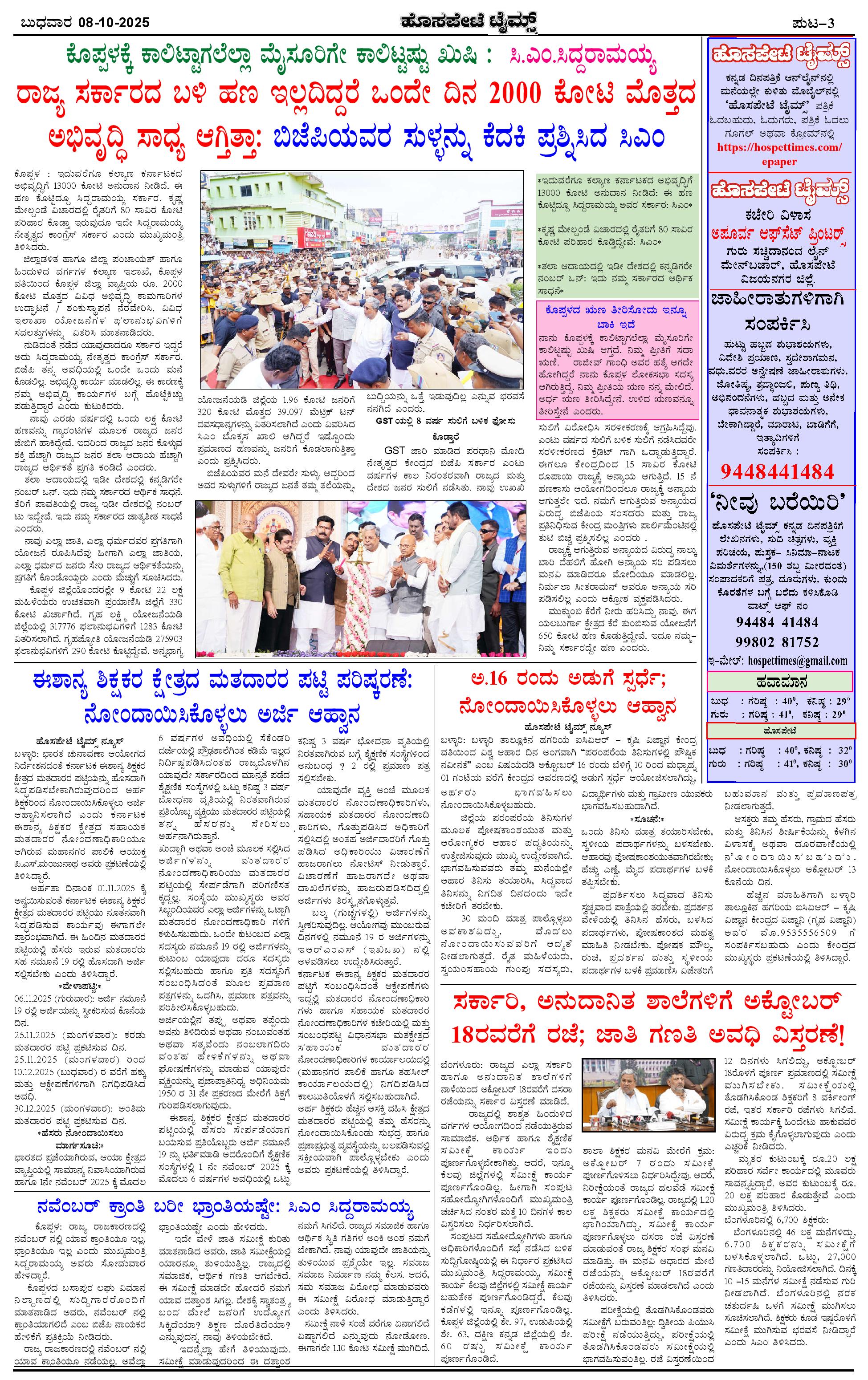 ಮಾಧ್ಯಮ ಅಕಾಡೆಮಿ ಪ್ರಶಸ್ತಿ ಪುರಸ್ಕೃತ 'ಹೊಸಪೇಟೆ ಟೈಮ್ಸ್' Page: 3 October 08, 2025 << First << 3 >> Last >> Page 1Page 2Page 3Page 4 × ಮಾಧ್ಯಮ ಅಕಾಡೆಮಿ ಪ್ರಶಸ್ತಿ ಪುರಸ್ಕೃತ 'ಹೊಸಪೇಟೆ ಟೈಮ್ಸ್' HPT-08102025--4-page-001HPT-08102025--4-page-002HPT-08102025--4-page-003HPT-08102025--4-page-004 << First << 3 >> Last >> HPT-08102025--4-page-001HPT-08102025--4-page-002HPT-08102025--4-page-003HPT-08102025--4-page-004 HPT-08102025--4-page-003