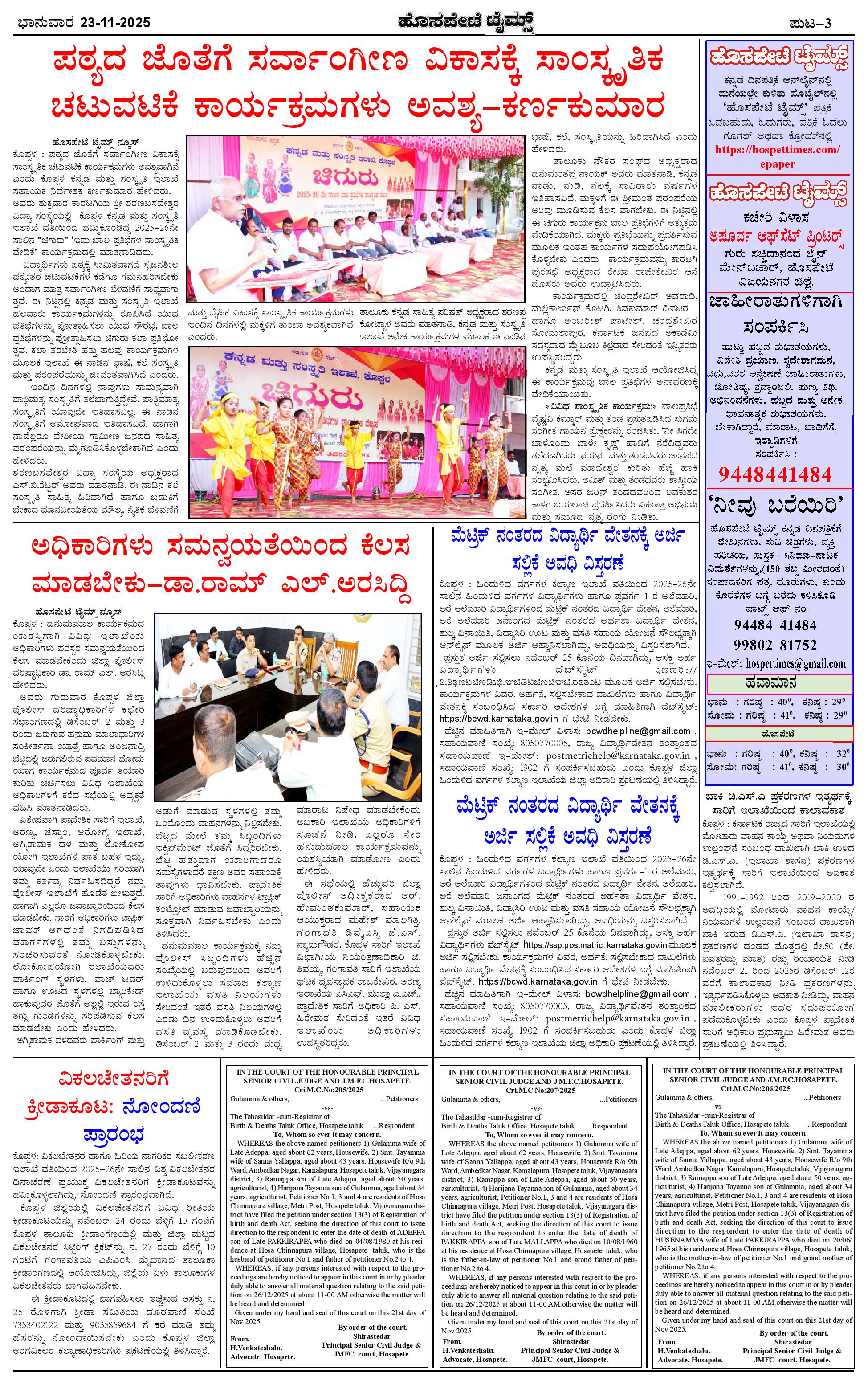 ಮಾಧ್ಯಮ ಅಕಾಡೆಮಿ ಪ್ರಶಸ್ತಿ ಪುರಸ್ಕೃತ 'ಹೊಸಪೇಟೆ ಟೈಮ್ಸ್' Page: 3 November 23, 2025 << First << 3 >> Last >> Page 1Page 2Page 3Page 4 × ಮಾಧ್ಯಮ ಅಕಾಡೆಮಿ ಪ್ರಶಸ್ತಿ ಪುರಸ್ಕೃತ 'ಹೊಸಪೇಟೆ ಟೈಮ್ಸ್' HPT-23112025--4-page-001HPT-23112025--4-page-002HPT-23112025--4-page-003HPT-23112025--4-page-004 << First << 3 >> Last >> HPT-23112025--4-page-001HPT-23112025--4-page-002HPT-23112025--4-page-003HPT-23112025--4-page-004 HPT-23112025--4-page-003