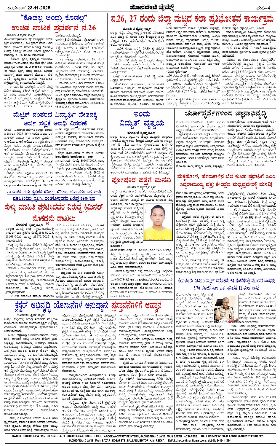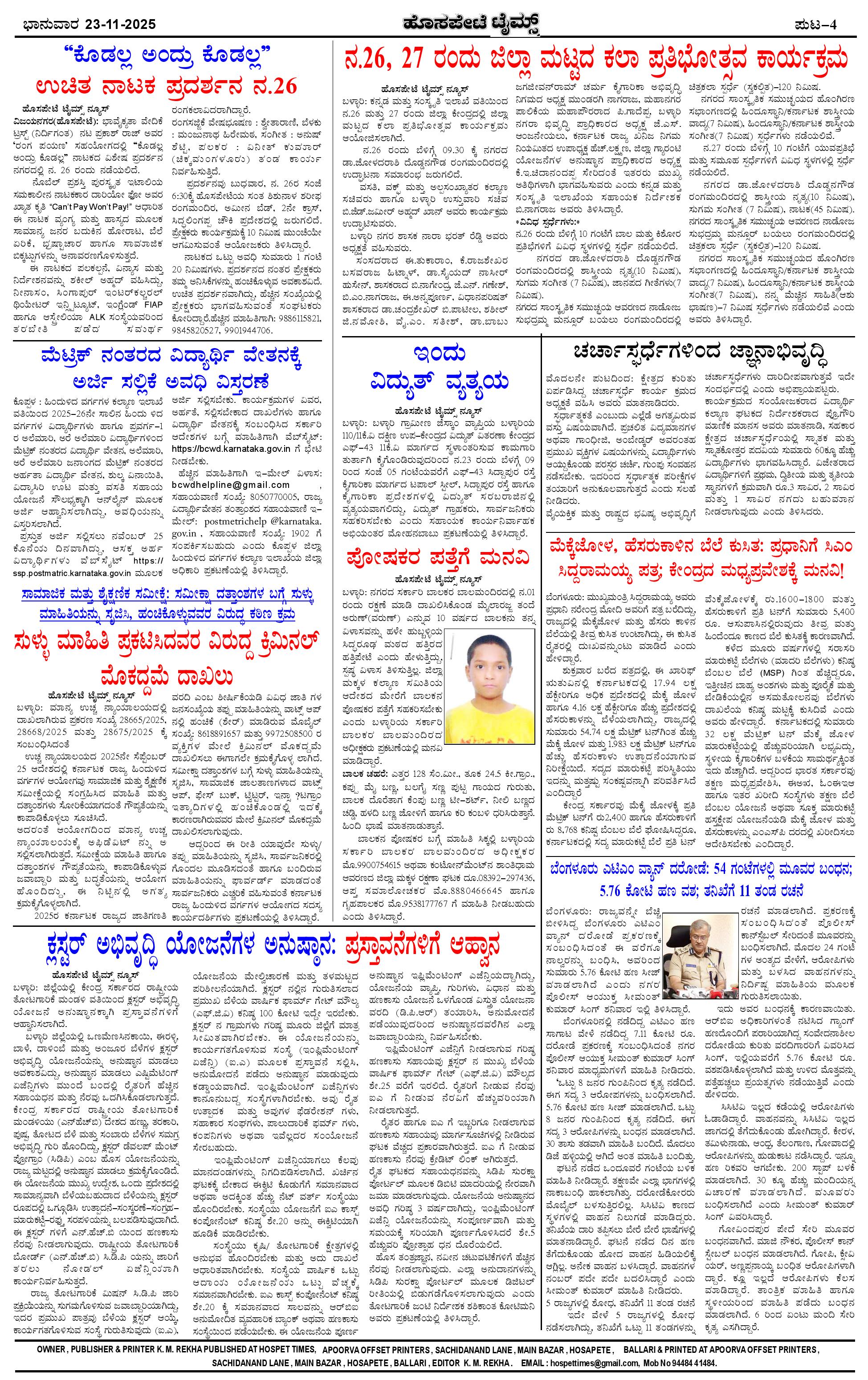ಮಾಧ್ಯಮ ಅಕಾಡೆಮಿ ಪ್ರಶಸ್ತಿ ಪುರಸ್ಕೃತ 'ಹೊಸಪೇಟೆ ಟೈಮ್ಸ್' Page: 4 November 23, 2025 << First << 4 >> Last >> Page 1Page 2Page 3Page 4 × ಮಾಧ್ಯಮ ಅಕಾಡೆಮಿ ಪ್ರಶಸ್ತಿ ಪುರಸ್ಕೃತ 'ಹೊಸಪೇಟೆ ಟೈಮ್ಸ್' HPT-23112025-4 PAGE-page-001HPT-23112025-4 PAGE-page-002HPT-23112025-4 PAGE-page-003HPT-23112025-4 PAGE-page-004 << First << 4 >> Last >> HPT-23112025-4 PAGE-page-001HPT-23112025-4 PAGE-page-002HPT-23112025-4 PAGE-page-003HPT-23112025-4 PAGE-page-004 HPT-23112025-4 PAGE-page-004