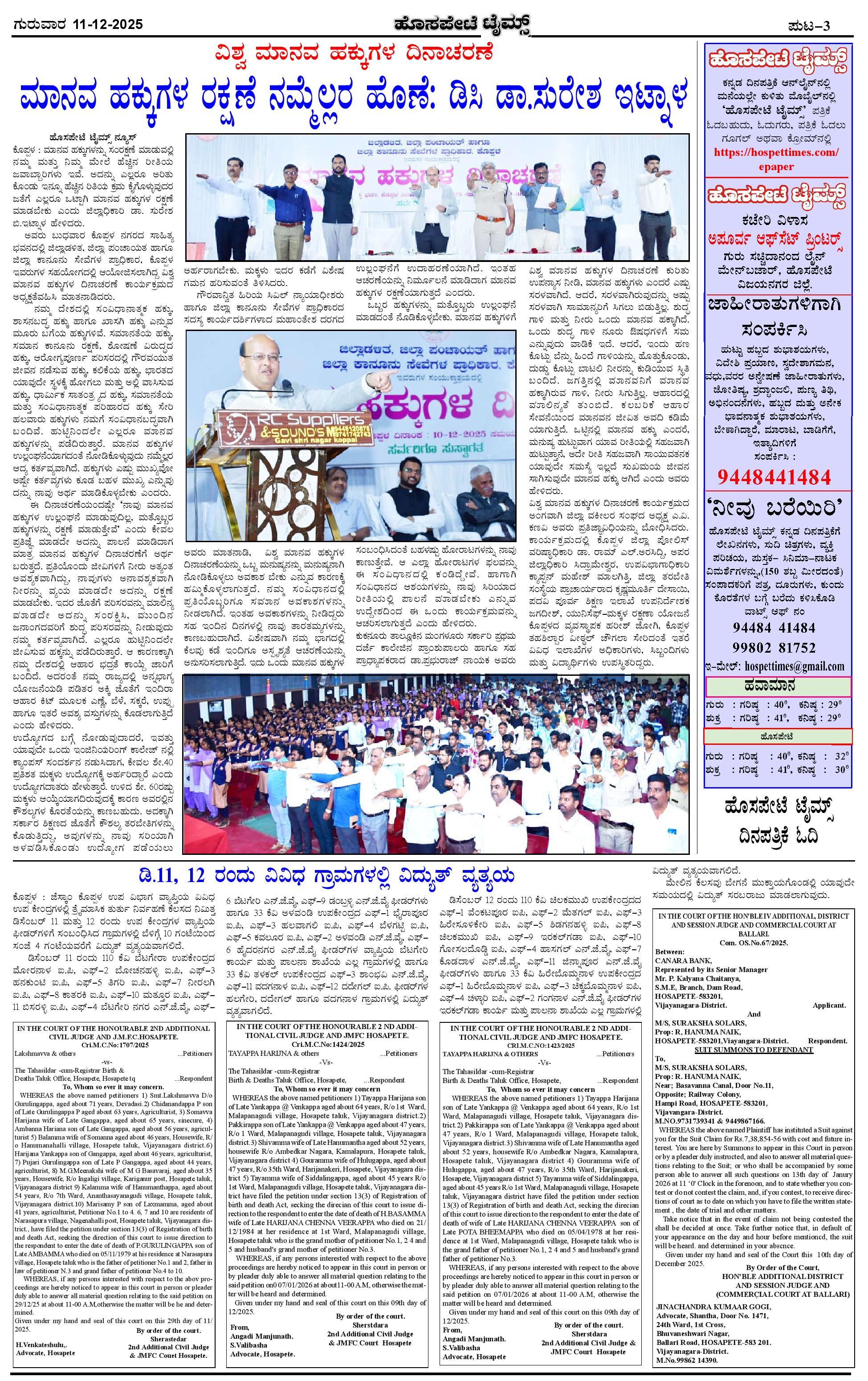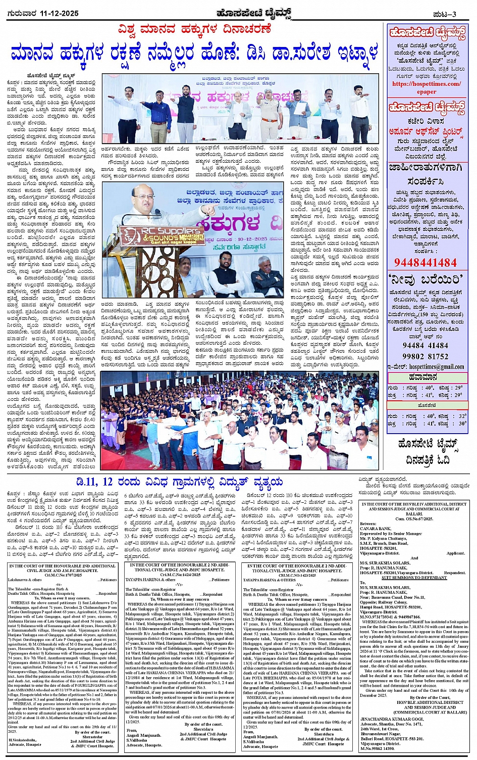 ಮಾಧ್ಯಮ ಅಕಾಡೆಮಿ ಪ್ರಶಸ್ತಿ ಪುರಸ್ಕೃತ 'ಹೊಸಪೇಟೆ ಟೈಮ್ಸ್' Page: 3 December 11, 2025 << First << 3 >> Last >> Page 1Page 2Page 3Page 4 × ಮಾಧ್ಯಮ ಅಕಾಡೆಮಿ ಪ್ರಶಸ್ತಿ ಪುರಸ್ಕೃತ 'ಹೊಸಪೇಟೆ ಟೈಮ್ಸ್' HPT-11122025--4-page-001HPT-11122025--4-page-002HPT-11122025--4-page-003HPT-11122025--4-page-004 << First << 3 >> Last >> HPT-11122025--4-page-001HPT-11122025--4-page-002HPT-11122025--4-page-003HPT-11122025--4-page-004 HPT-11122025--4-page-003