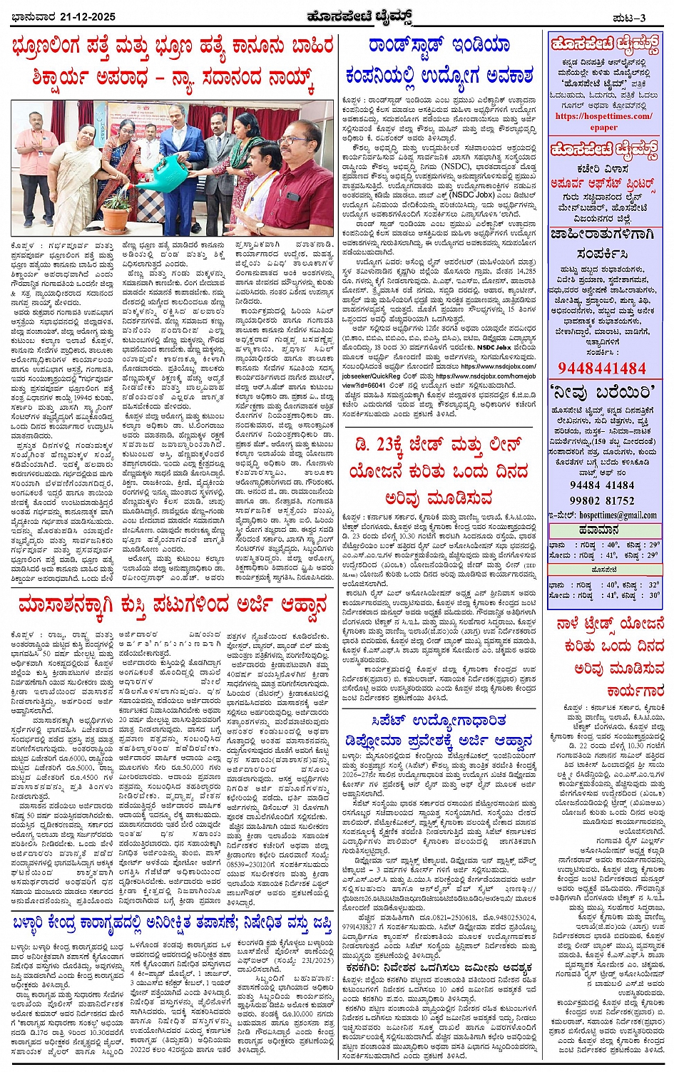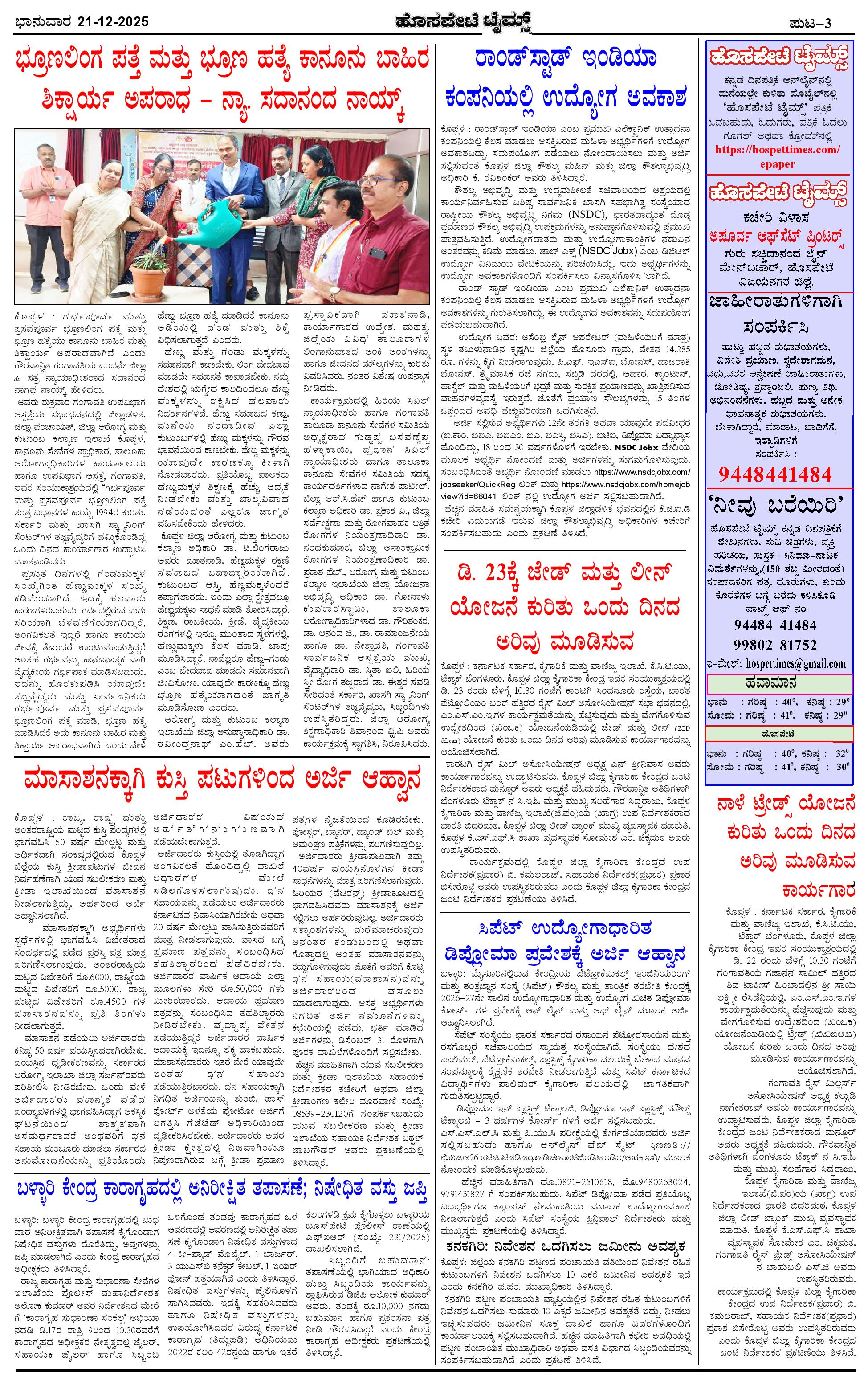 ಮಾಧ್ಯಮ ಅಕಾಡೆಮಿ ಪ್ರಶಸ್ತಿ ಪುರಸ್ಕೃತ 'ಹೊಸಪೇಟೆ ಟೈಮ್ಸ್' Page: 3 December 21, 2025 << First << 3 >> Last >> Page 1Page 2Page 3Page 4 × ಮಾಧ್ಯಮ ಅಕಾಡೆಮಿ ಪ್ರಶಸ್ತಿ ಪುರಸ್ಕೃತ 'ಹೊಸಪೇಟೆ ಟೈಮ್ಸ್' HPT-21122025--4-page-001HPT-21122025--4-page-002HPT-21122025--4-page-003HPT-21122025--4-page-004 << First << 3 >> Last >> HPT-21122025--4-page-001HPT-21122025--4-page-002HPT-21122025--4-page-003HPT-21122025--4-page-004 HPT-21122025--4-page-003