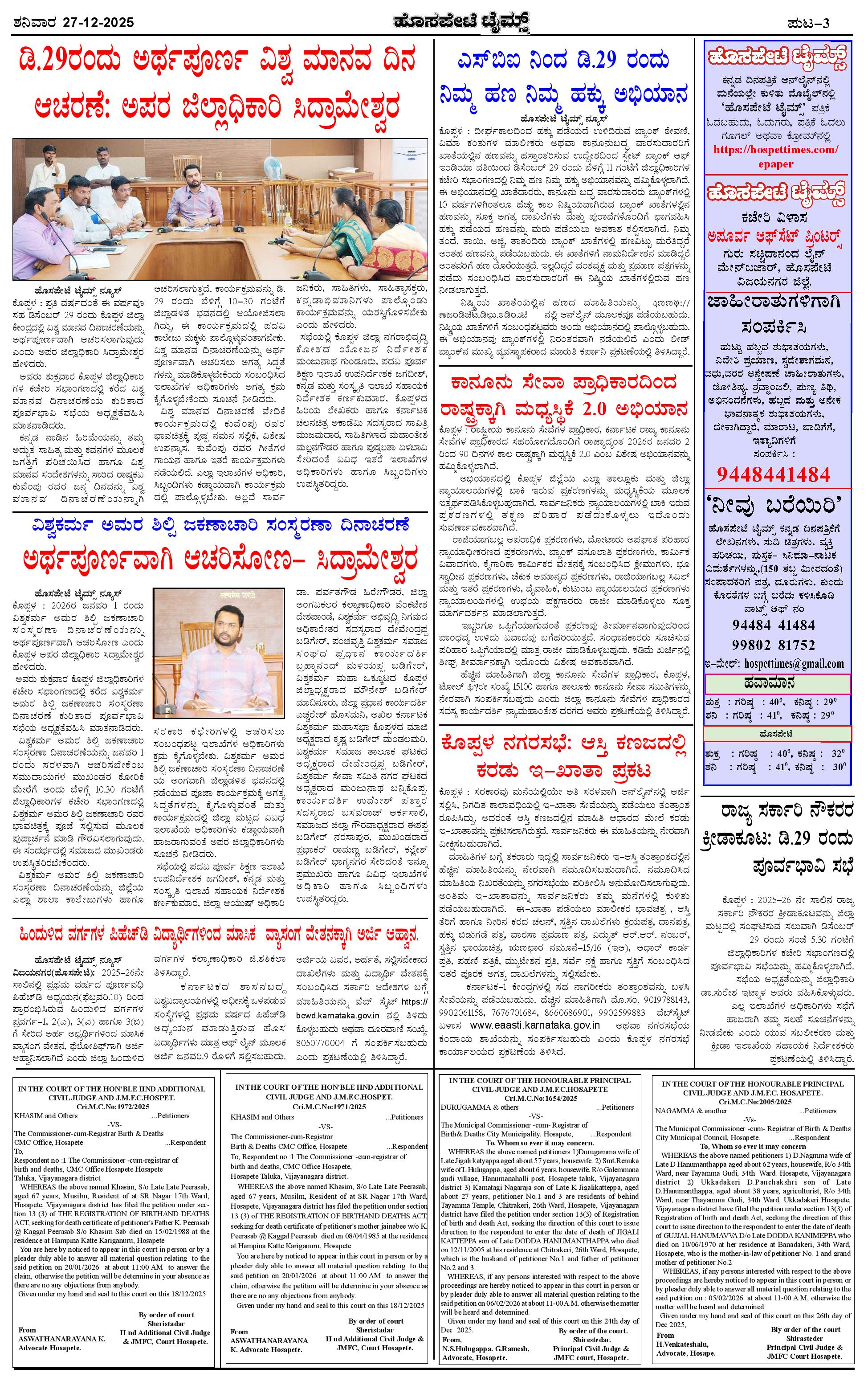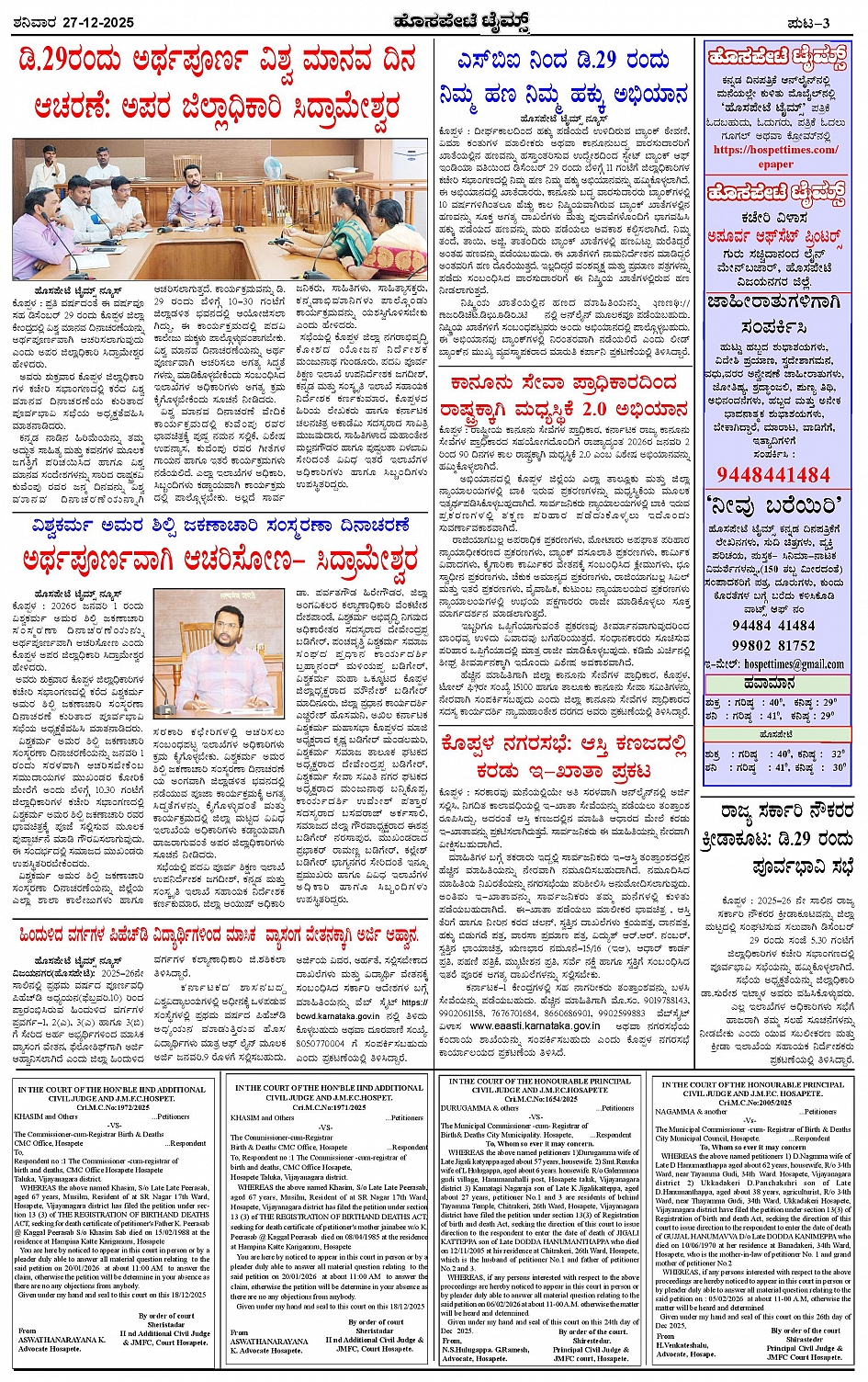 ಮಾಧ್ಯಮ ಅಕಾಡೆಮಿ ಪ್ರಶಸ್ತಿ ಪುರಸ್ಕೃತ 'ಹೊಸಪೇಟೆ ಟೈಮ್ಸ್' Page: 3 December 27, 2025 << First << 3 >> Last >> Page 1Page 2Page 3Page 4 × ಮಾಧ್ಯಮ ಅಕಾಡೆಮಿ ಪ್ರಶಸ್ತಿ ಪುರಸ್ಕೃತ 'ಹೊಸಪೇಟೆ ಟೈಮ್ಸ್' HPT-27122025--4-page-001HPT-27122025--4-page-002HPT-27122025--4-page-003HPT-27122025--4-page-004 << First << 3 >> Last >> HPT-27122025--4-page-001HPT-27122025--4-page-002HPT-27122025--4-page-003HPT-27122025--4-page-004 HPT-27122025--4-page-003