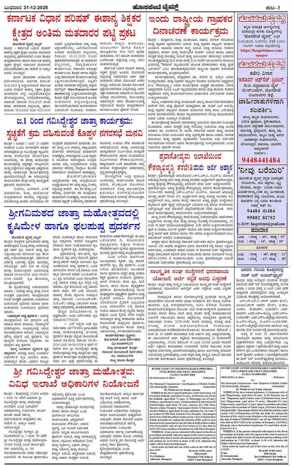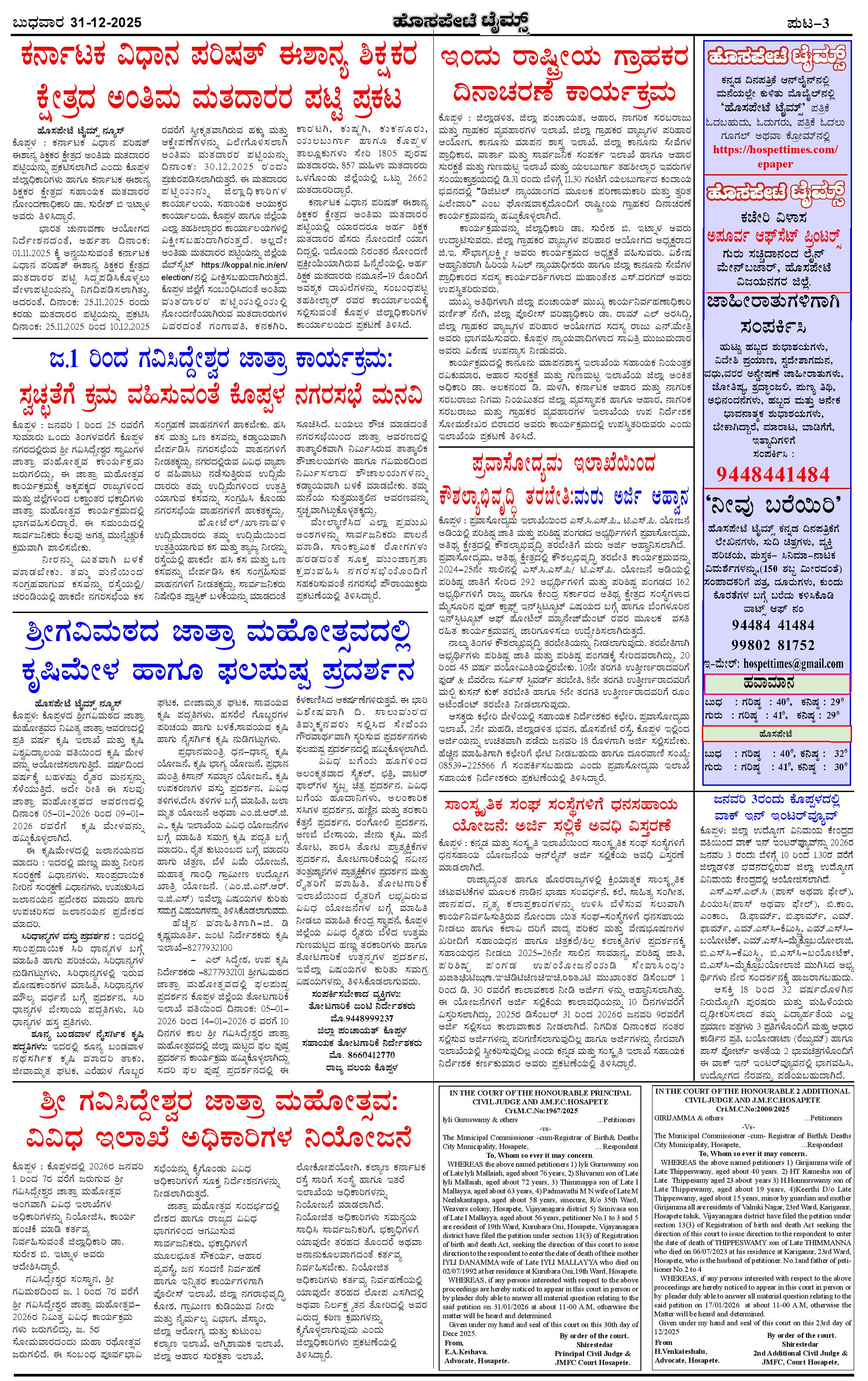 ಮಾಧ್ಯಮ ಅಕಾಡೆಮಿ ಪ್ರಶಸ್ತಿ ಪುರಸ್ಕೃತ 'ಹೊಸಪೇಟೆ ಟೈಮ್ಸ್' Page: 3 December 31, 2025 << First << 3 >> Last >> Page 1Page 2Page 3Page 4 × ಮಾಧ್ಯಮ ಅಕಾಡೆಮಿ ಪ್ರಶಸ್ತಿ ಪುರಸ್ಕೃತ 'ಹೊಸಪೇಟೆ ಟೈಮ್ಸ್' HPT-31122025--4-page-001HPT-31122025--4-page-002HPT-31122025--4-page-003HPT-31122025--4-page-004 << First << 3 >> Last >> HPT-31122025--4-page-001HPT-31122025--4-page-002HPT-31122025--4-page-003HPT-31122025--4-page-004 HPT-31122025--4-page-003