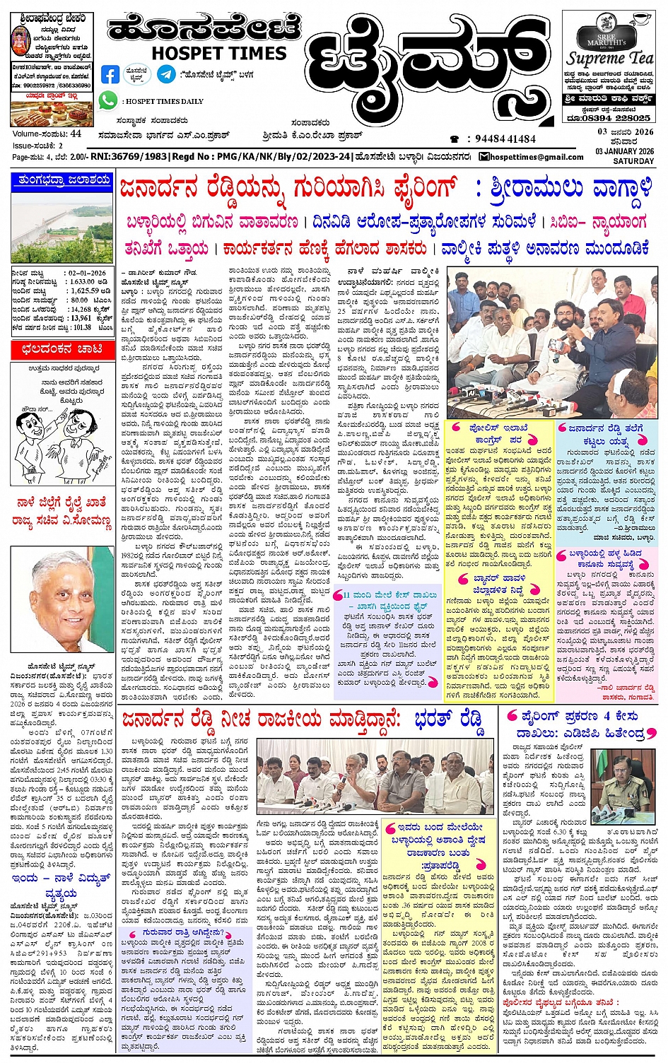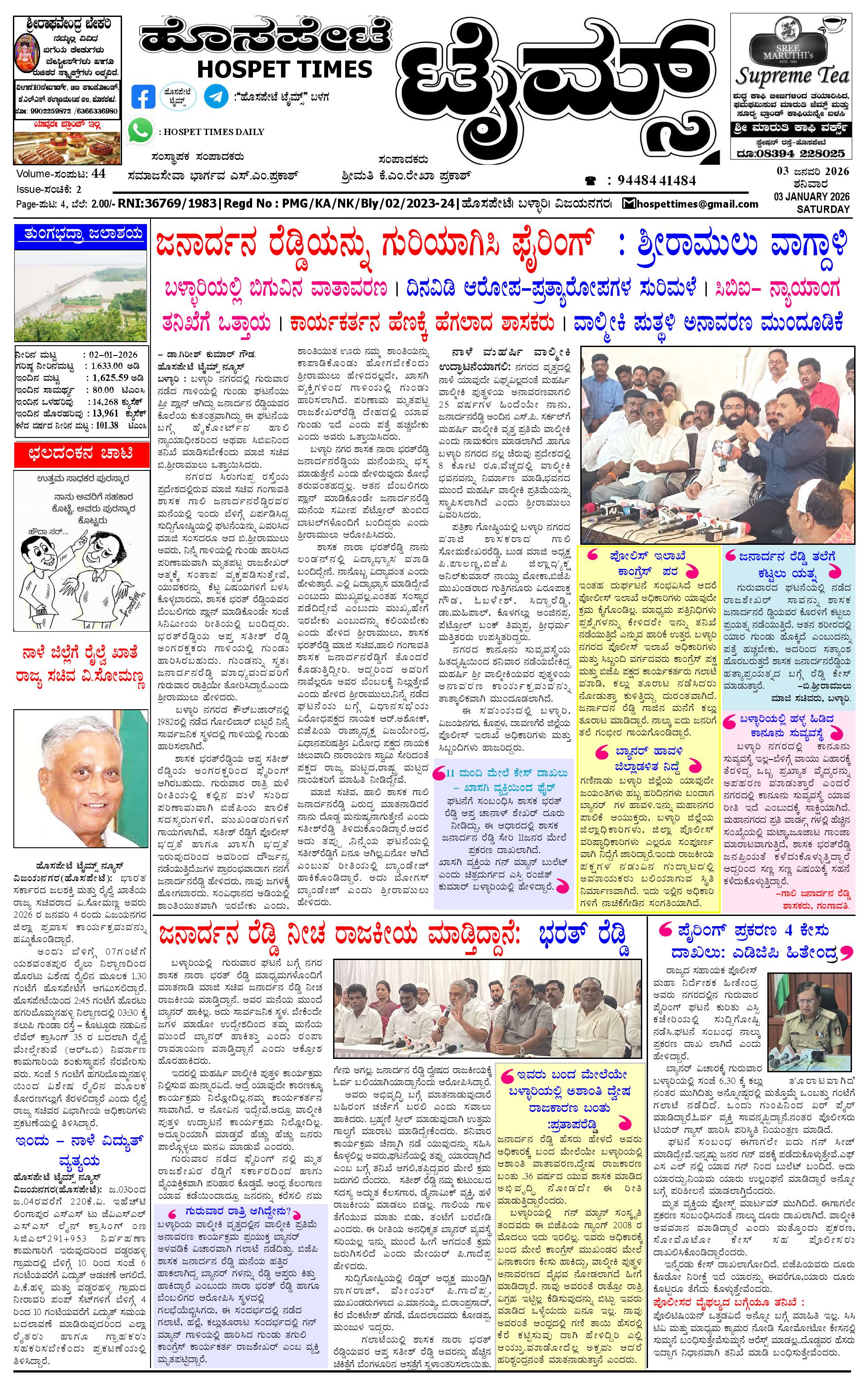 ಮಾಧ್ಯಮ ಅಕಾಡೆಮಿ ಪ್ರಶಸ್ತಿ ಪುರಸ್ಕೃತ 'ಹೊಸಪೇಟೆ ಟೈಮ್ಸ್' January 03, 2026 ಸ್ಥಳೀಯ ಸುದ್ದಿಗಳ ನೈಜ ಬಿಂಬ << First << 1 >> Last >> Page 1Page 2Page 3Page 4 × ಮಾಧ್ಯಮ ಅಕಾಡೆಮಿ ಪ್ರಶಸ್ತಿ ಪುರಸ್ಕೃತ 'ಹೊಸಪೇಟೆ ಟೈಮ್ಸ್' JAN03012026-page-001JAN03012026-page-002JAN03012026-page-003JAN03012026-page-004 << First << 1 >> Last >> JAN03012026-page-001JAN03012026-page-002JAN03012026-page-003JAN03012026-page-004 JAN03012026-page-001