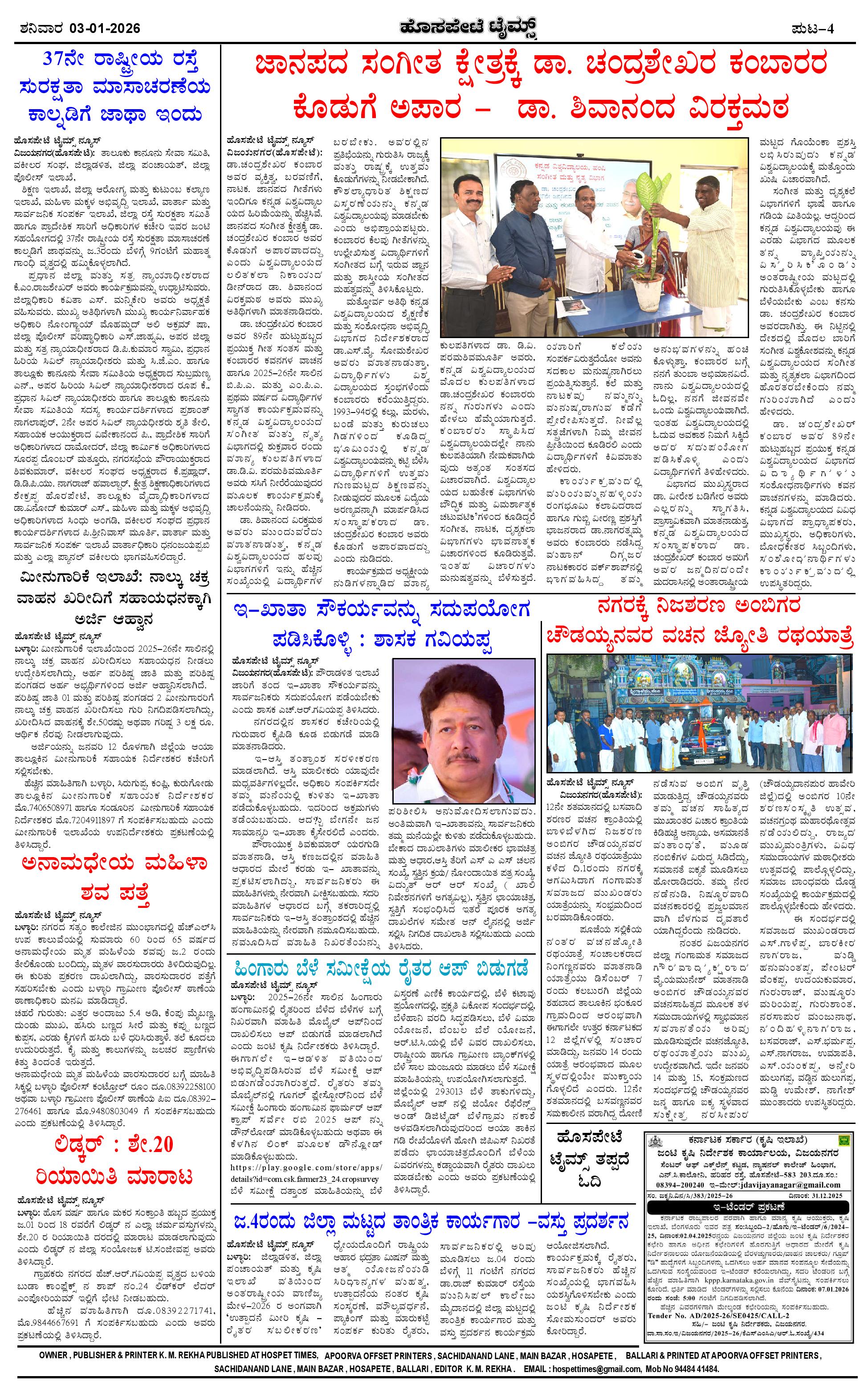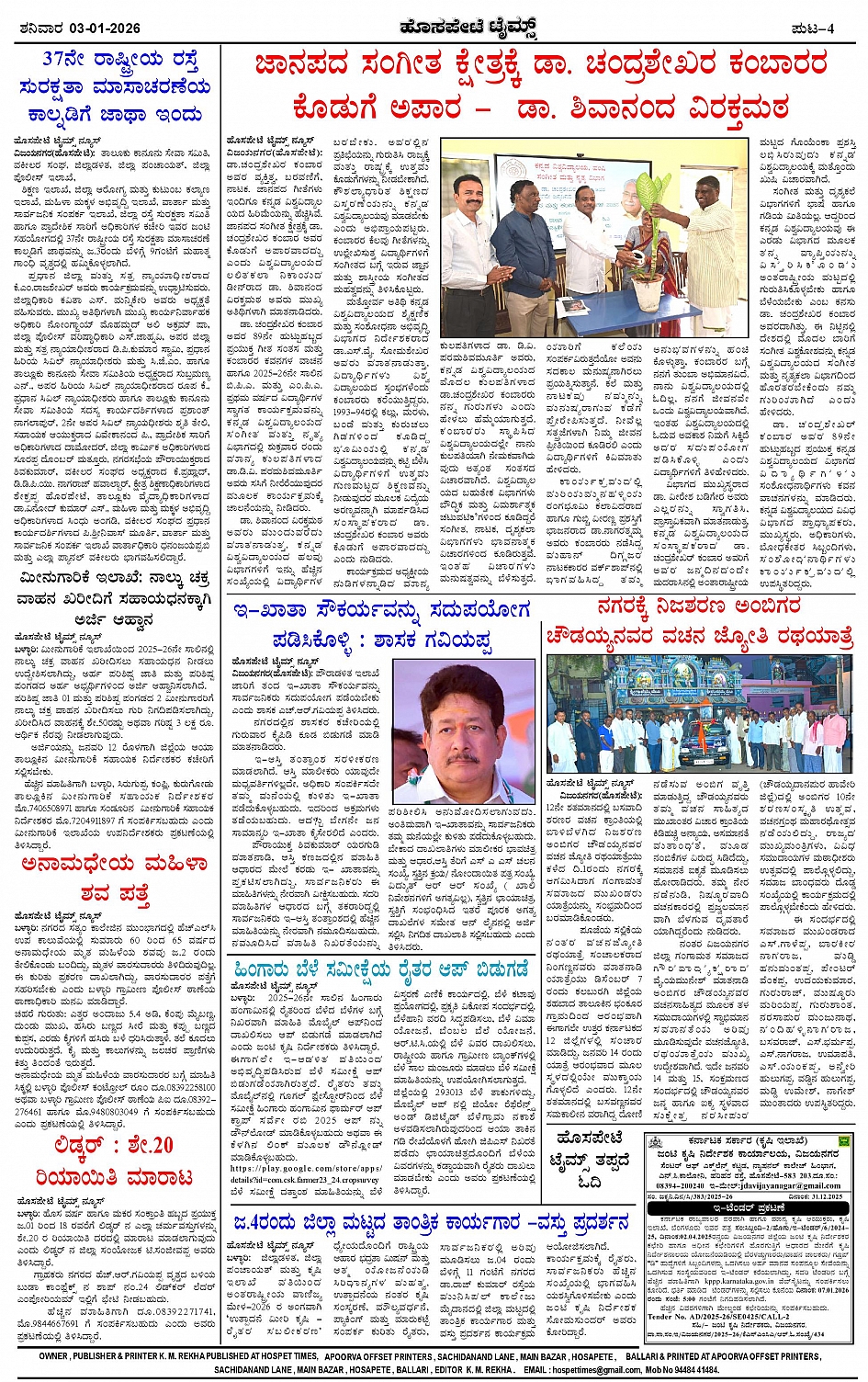 ಮಾಧ್ಯಮ ಅಕಾಡೆಮಿ ಪ್ರಶಸ್ತಿ ಪುರಸ್ಕೃತ 'ಹೊಸಪೇಟೆ ಟೈಮ್ಸ್' Page: 4 January 03, 2026 ಸ್ಥಳೀಯ ಸುದ್ದಿಗಳ ನೈಜ ಬಿಂಬ << First << 4 >> Last >> Page 1Page 2Page 3Page 4 × ಮಾಧ್ಯಮ ಅಕಾಡೆಮಿ ಪ್ರಶಸ್ತಿ ಪುರಸ್ಕೃತ 'ಹೊಸಪೇಟೆ ಟೈಮ್ಸ್' JAN03012026-page-001JAN03012026-page-002JAN03012026-page-003JAN03012026-page-004 << First << 4 >> Last >> JAN03012026-page-001JAN03012026-page-002JAN03012026-page-003JAN03012026-page-004 JAN03012026-page-004