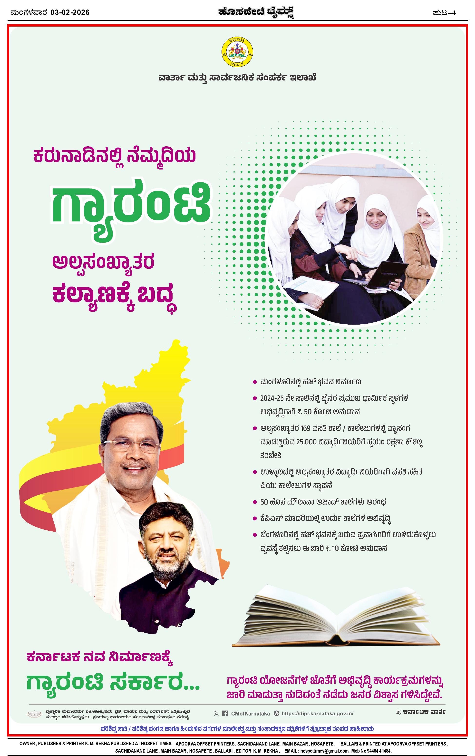 ಮಾಧ್ಯಮ ಅಕಾಡೆಮಿ ಪ್ರಶಸ್ತಿ ಪುರಸ್ಕೃತ 'ಹೊಸಪೇಟೆ ಟೈಮ್ಸ್' Page: 4 February 03, 2026 << First << 4 >> Last >> Page 1Page 2Page 3Page 4 × ಮಾಧ್ಯಮ ಅಕಾಡೆಮಿ ಪ್ರಶಸ್ತಿ ಪುರಸ್ಕೃತ 'ಹೊಸಪೇಟೆ ಟೈಮ್ಸ್' HPT-03022026--4-page-001HPT-03022026--4-page-002HPT-03022026--4-page-003HPT-03022026--4-page-004 << First << 4 >> Last >> HPT-03022026--4-page-001HPT-03022026--4-page-002HPT-03022026--4-page-003HPT-03022026--4-page-004 HPT-03022026--4-page-004