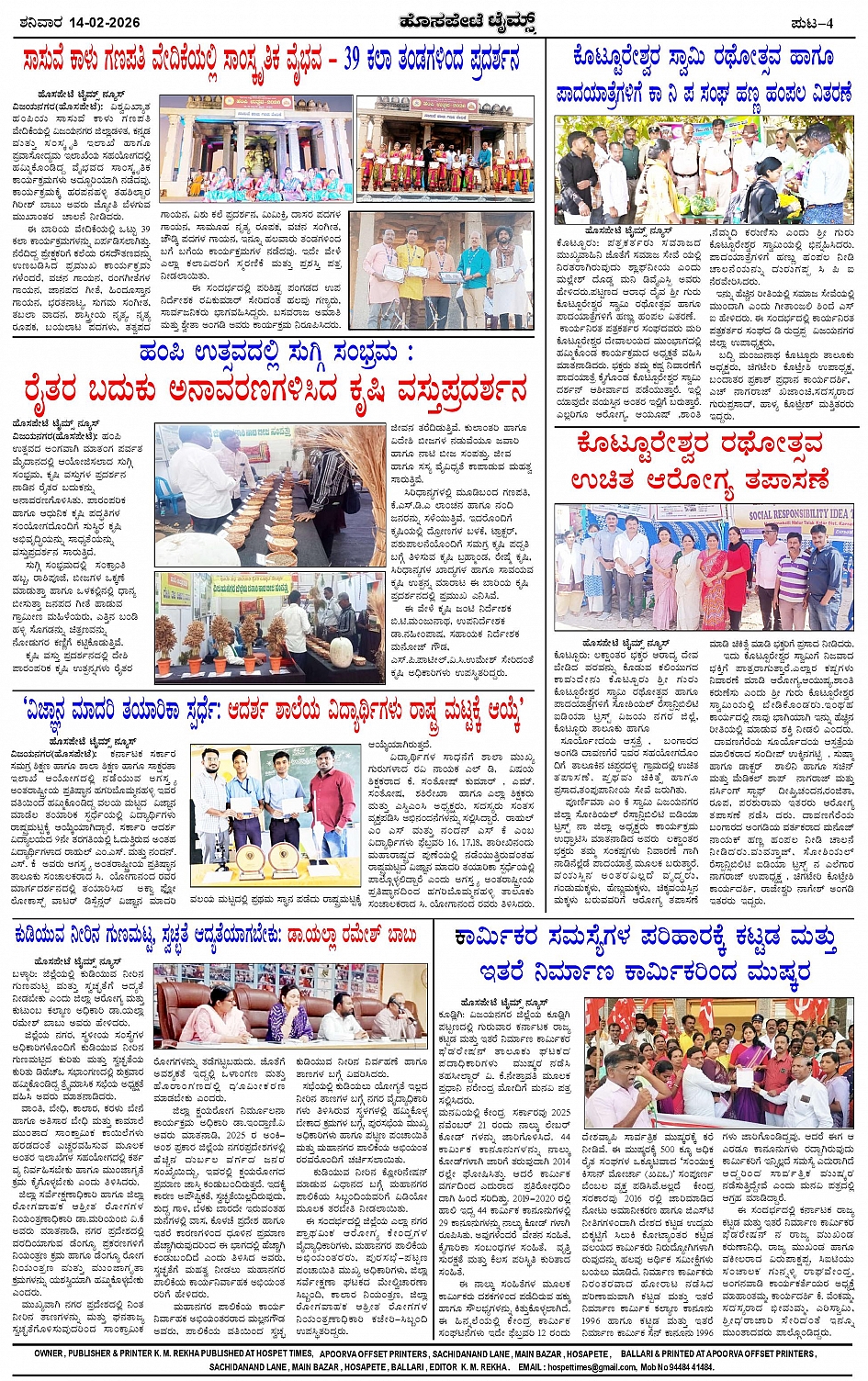 ಮಾಧ್ಯಮ ಅಕಾಡೆಮಿ ಪ್ರಶಸ್ತಿ ಪುರಸ್ಕೃತ 'ಹೊಸಪೇಟೆ ಟೈಮ್ಸ್' Page: 4 February 14, 2026 << First << 4 >> Last >> Page 1Page 2Page 3Page 4 × ಮಾಧ್ಯಮ ಅಕಾಡೆಮಿ ಪ್ರಶಸ್ತಿ ಪುರಸ್ಕೃತ 'ಹೊಸಪೇಟೆ ಟೈಮ್ಸ್' HPT-14022026--4-page-001HPT-14022026--4-page-002HPT-14022026--4-page-003HPT-14022026--4-page-004 << First << 4 >> Last >> HPT-14022026--4-page-001HPT-14022026--4-page-002HPT-14022026--4-page-003HPT-14022026--4-page-004 HPT-14022026--4-page-004