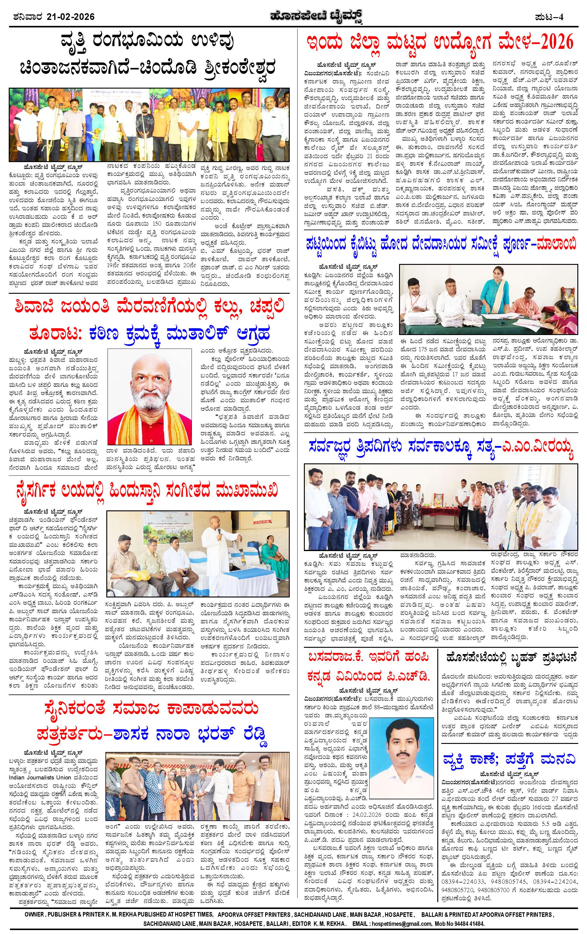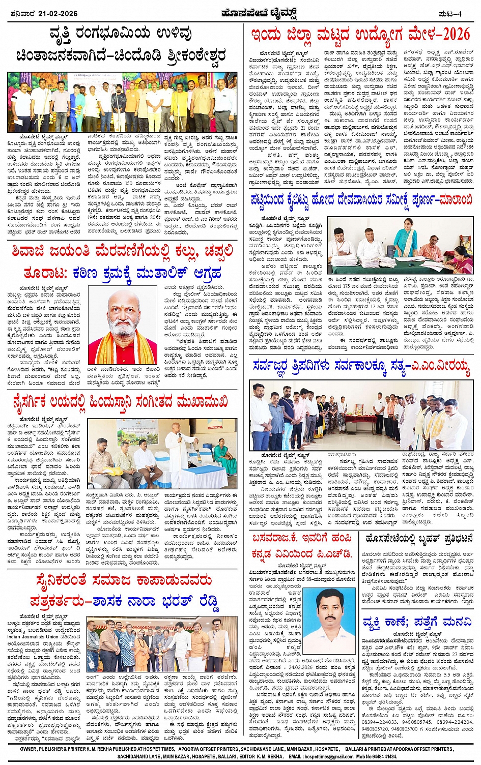 ಮಾಧ್ಯಮ ಅಕಾಡೆಮಿ ಪ್ರಶಸ್ತಿ ಪುರಸ್ಕೃತ 'ಹೊಸಪೇಟೆ ಟೈಮ್ಸ್' Page: 4 February 21, 2026 << First << 4 >> Last >> Page 1Page 2Page 3Page 4 × ಮಾಧ್ಯಮ ಅಕಾಡೆಮಿ ಪ್ರಶಸ್ತಿ ಪುರಸ್ಕೃತ 'ಹೊಸಪೇಟೆ ಟೈಮ್ಸ್' HPT-21022026--4-page-001HPT-21022026--4-page-002HPT-21022026--4-page-003HPT-21022026--4-page-004 << First << 4 >> Last >> HPT-21022026--4-page-001HPT-21022026--4-page-002HPT-21022026--4-page-003HPT-21022026--4-page-004 HPT-21022026--4-page-004