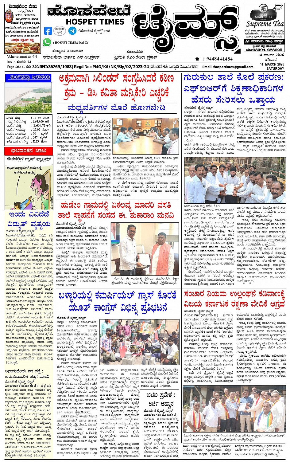 ಮಾಧ್ಯಮ ಅಕಾಡೆಮಿ ಪ್ರಶಸ್ತಿ ಪುರಸ್ಕೃತ 'ಹೊಸಪೇಟೆ ಟೈಮ್ಸ್' March 14, 2026 ಸ್ಥಳೀಯ ಸುದ್ದಿಗಳ ನೈಜ ಪ್ರತಿಬಿಂಬ << First << 1 >> Last >> Page 1Page 2Page 3Page 4 × ಮಾಧ್ಯಮ ಅಕಾಡೆಮಿ ಪ್ರಶಸ್ತಿ ಪುರಸ್ಕೃತ 'ಹೊಸಪೇಟೆ ಟೈಮ್ಸ್' HPT-14032026.F-page-001HPT-14032026.F-page-002HPT-14032026.F-page-003HPT-14032026.F-page-004 << First << 1 >> Last >> HPT-14032026.F-page-001HPT-14032026.F-page-002HPT-14032026.F-page-003HPT-14032026.F-page-004 HPT-14032026.F-page-001